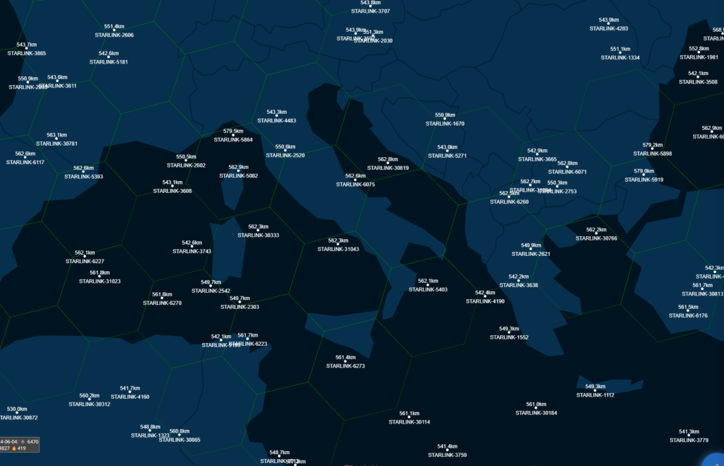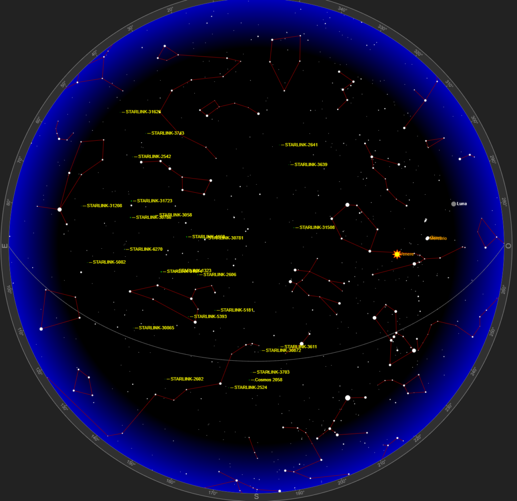 Ogni satellite Starlink può gestire circa 2000 utenze, di conseguenza il numero minimo di satelliti necessari, con rete a pieno carico è di 20 satelliti. Come potete vedere dall’immagine sotto (satellitemaps) i satelliti Starlink che si trovano sopra l’Italia sono sempre un po’ di più, bisogna tenere conto infatti che l’altezza rende possibile vedere anche i satelliti che non si trovano esattamente sopra il nostro cielo ma anche un po’ oltre, come testimonia la seconda immagine, un estratto dello sky live view sopra roma (Heavens-above).