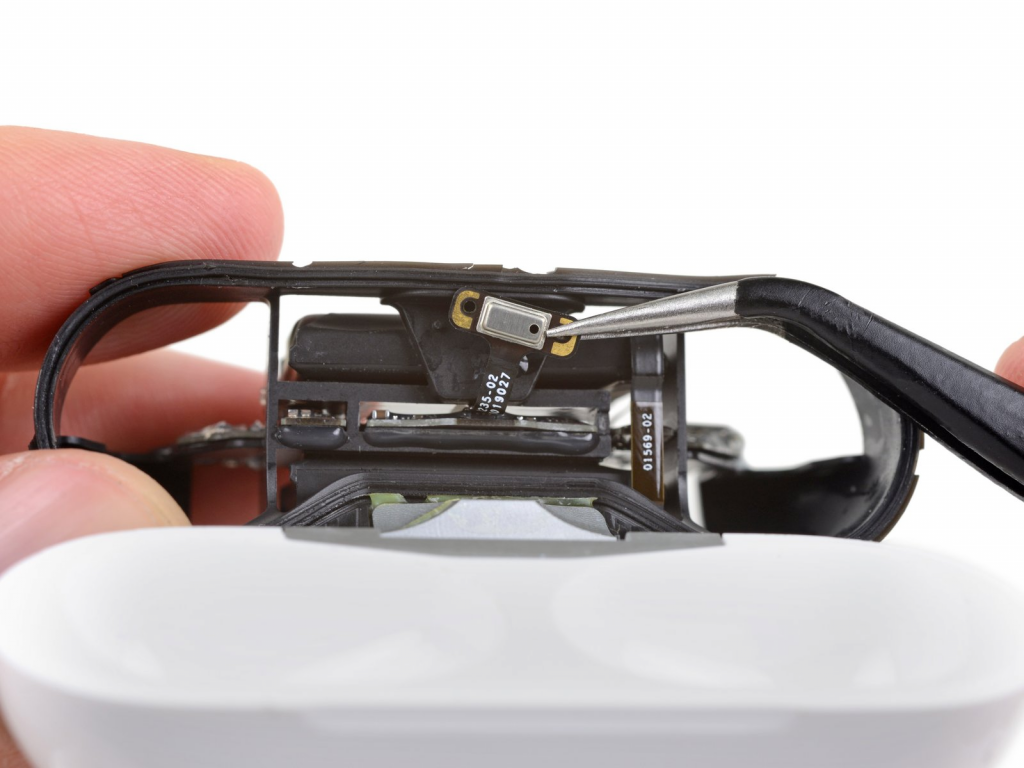 Tutte le componenti presenti all’interno delle AirPods Pro sono piccolissime, ed in tutto le cuffie pesano quasi 5 grammi, un vero capolavoro di miniaturizzazione. Il design non modulare è tenuto insieme da abbondante colla, che non solo aiuta i pezzi a stare al suo posto ma combatte anche l’infiltrazione di acqua e polvere.