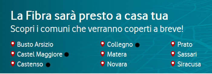 I comuni fin qui evidenziati si aggiungeranno quindi alla lista delle città in cui è già presente la fibra FTTH di Vodafone: Milano, Cinisello Balsamo, Bresso, Buccinasco, Monza, Opera, Rozzano, San Giuliano Milanese, San Donato Milanese, Sesto San Giovanni, Corsico, Cornaredo, Pioltello, Segrate, Settimo Milanese, Trezzano sul Naviglio, Vimodrone, Napoli, Bologna, Genova, Torino, Beinasco, Grugliasco, Moncalieri, Nichelino, Orbassano, Settimo Torinese, Venaria Reale, Bari, Cagliari, Catania, Palermo, Perugia, Venezia, Padova e Udine.