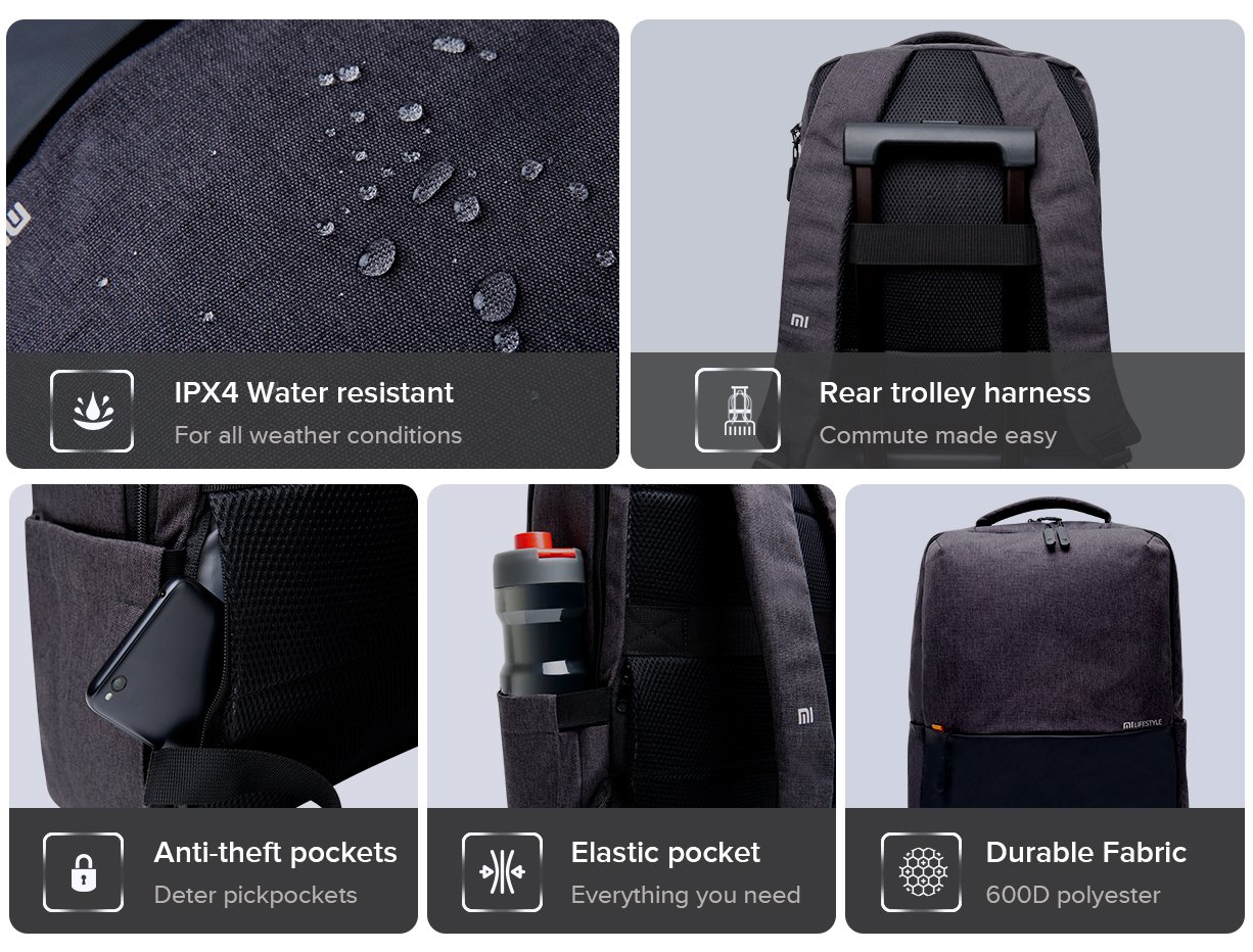 Lo zaino Mi Business Casual ha un design minimalista che unisce moda e funzionalità. L’esterno è rivestito in poliestere 100% 600D con finitura bicolore (tonalità nere e grigie). Anche l’interno è realizzato in poliestere. Lo zaino ha ricevuto una classificazione IPX4, quindi è resistente agli spruzzi d’acqua e alla neve anche se non all’immersione. C’è un imbracatura posteriore, delle cinghie extra imbottite, un vano antifurto e una tasca elastica per una bottiglia d’acqua.