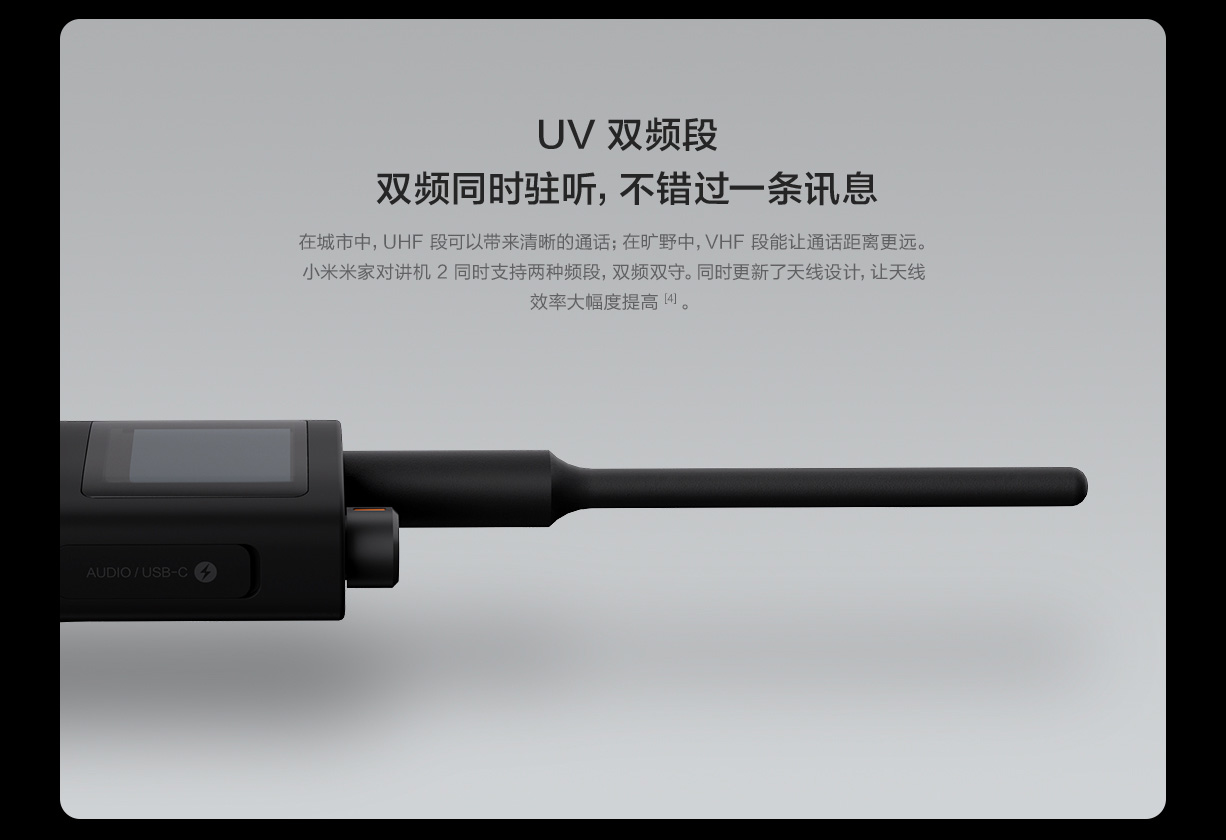 Il Mijia Walkie Talkie 2 ha uno schermo del tutto diverso rispetto alla prima generazione, realizzato con tecnologia LCD e con una diagonale da 1,77 pollici che permette di visualizzare più caratteri e informazioni come il livello della batteria e la frequenza di trasmissione.