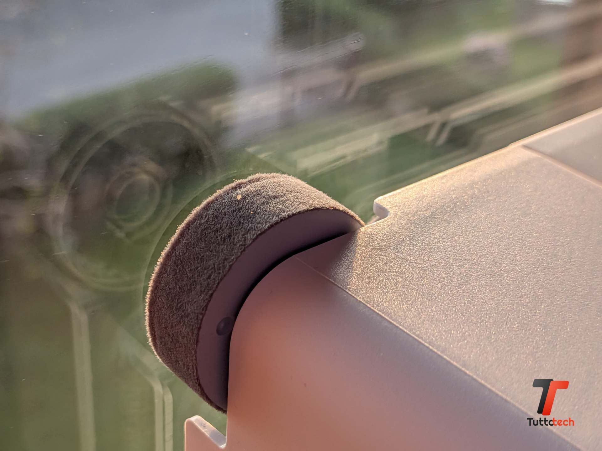 Il robot in sé pesa 1,6 kg e ha una forma quadrata, misurando circa 26 x 26 centimetri, Abbiamo apprezzato la maniglia in similpelle posizionata nella parte superiore, utilissima per tenere saldamente il robot quando viene posizionato sul vetro o quando viene rimosso. La qualità delle plastiche, così come quella dell’assemblaggio, è decisamente elevata, e dopo un paio di mesi di utilizzo decisamente intenso (almeno quattro volte a settimana), non abbiamo rilevato particolari segni di usura.
