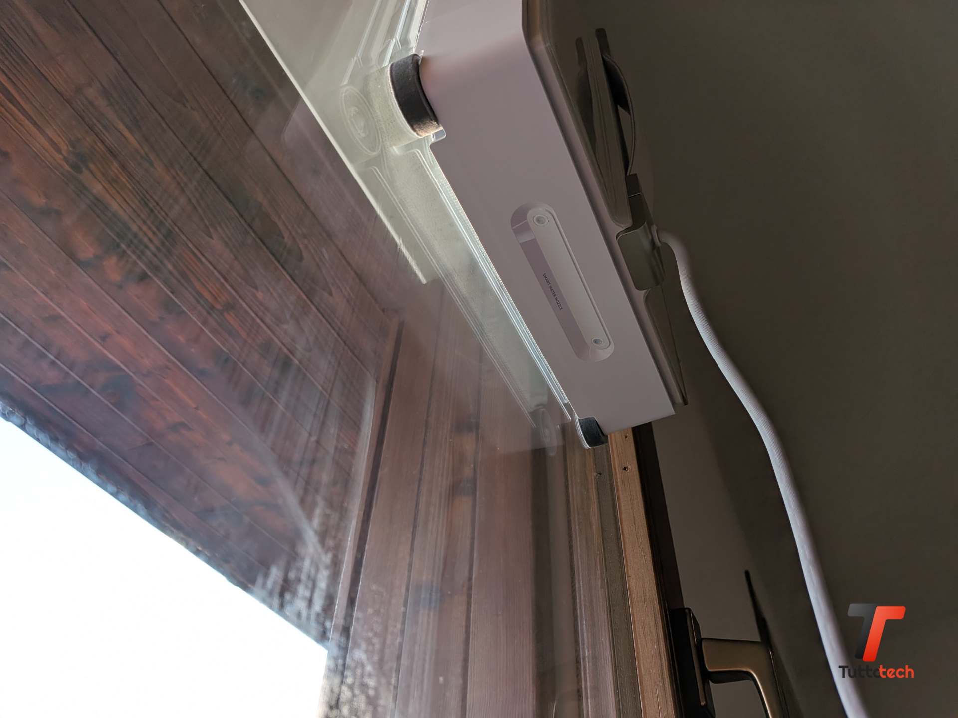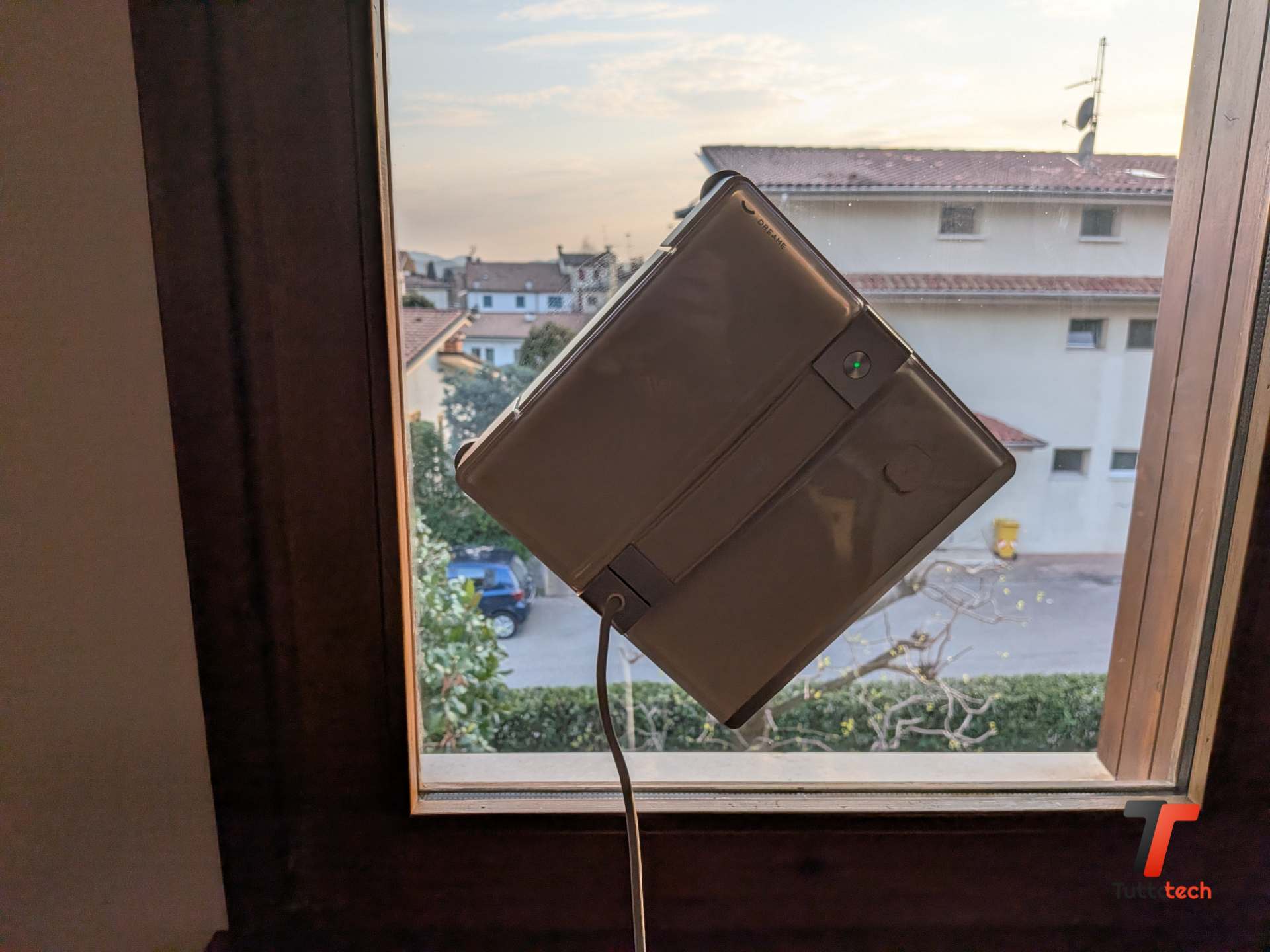 Il sistema di sicurezza è uno degli aspetti più convincenti di questa stazione. Oltre alla potente aspirazione, che di fatto non ha mai consentito al robottino di cadere, la stazione funge da contrappeso ed è in grado di sostenere senza alcun problema il robottino qualora succedesse qualcosa di imprevisto (a patto ovviamente di passare il cavo sopra la finestra). Il cavo anticaduta supporta anche strappi molto forti, è tarato fino a 140 Kg, quindi anche se dovesse cadere dall’esterno del vetro e fare qualche piano, il robottino rimarrà saldamente collegato alla base.