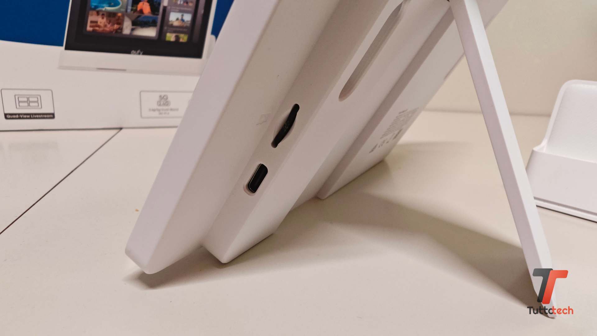 Decisamente comoda la base, che lascia lo schermo leggermente inclinato verso la parte posteriore, facendolo diventare perfetto per la scrivania ma anche per un mobile in soggiorno. Tramite il supporto è possibile alimentare in maniera continua il tablet, che sulla parte inferiore dispone di due contatti magnetici per la ricarica, evitando così spegnimenti indesiderati. Potete comunque impostare un timeout e un orario in cui il tablet va in stand-by, così da evitare consumi inutili di notte.