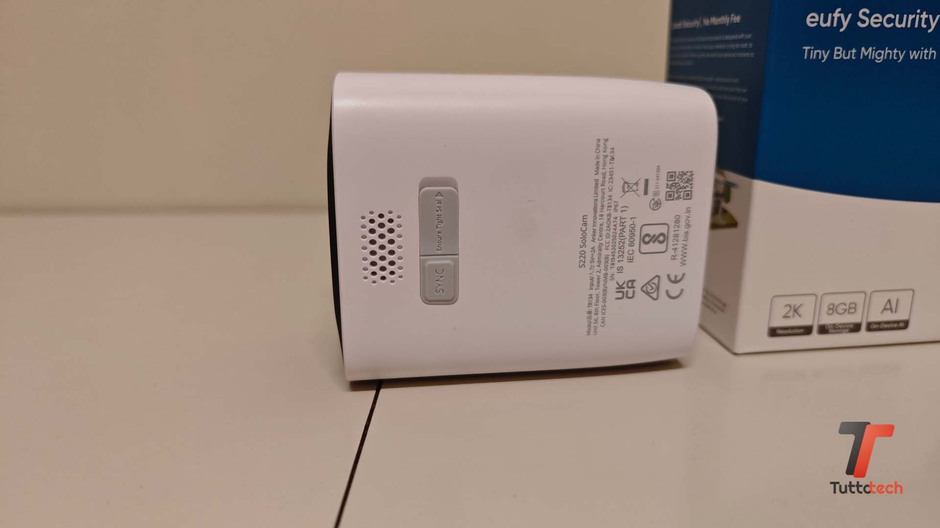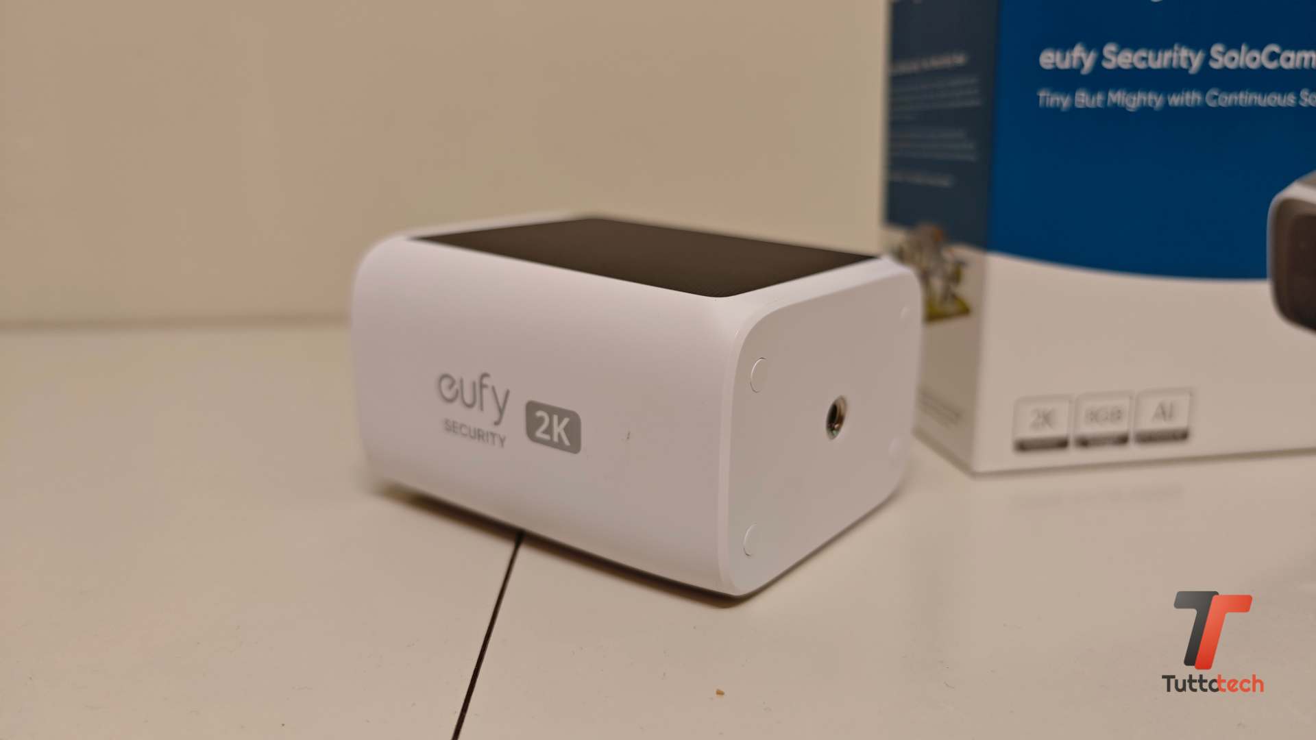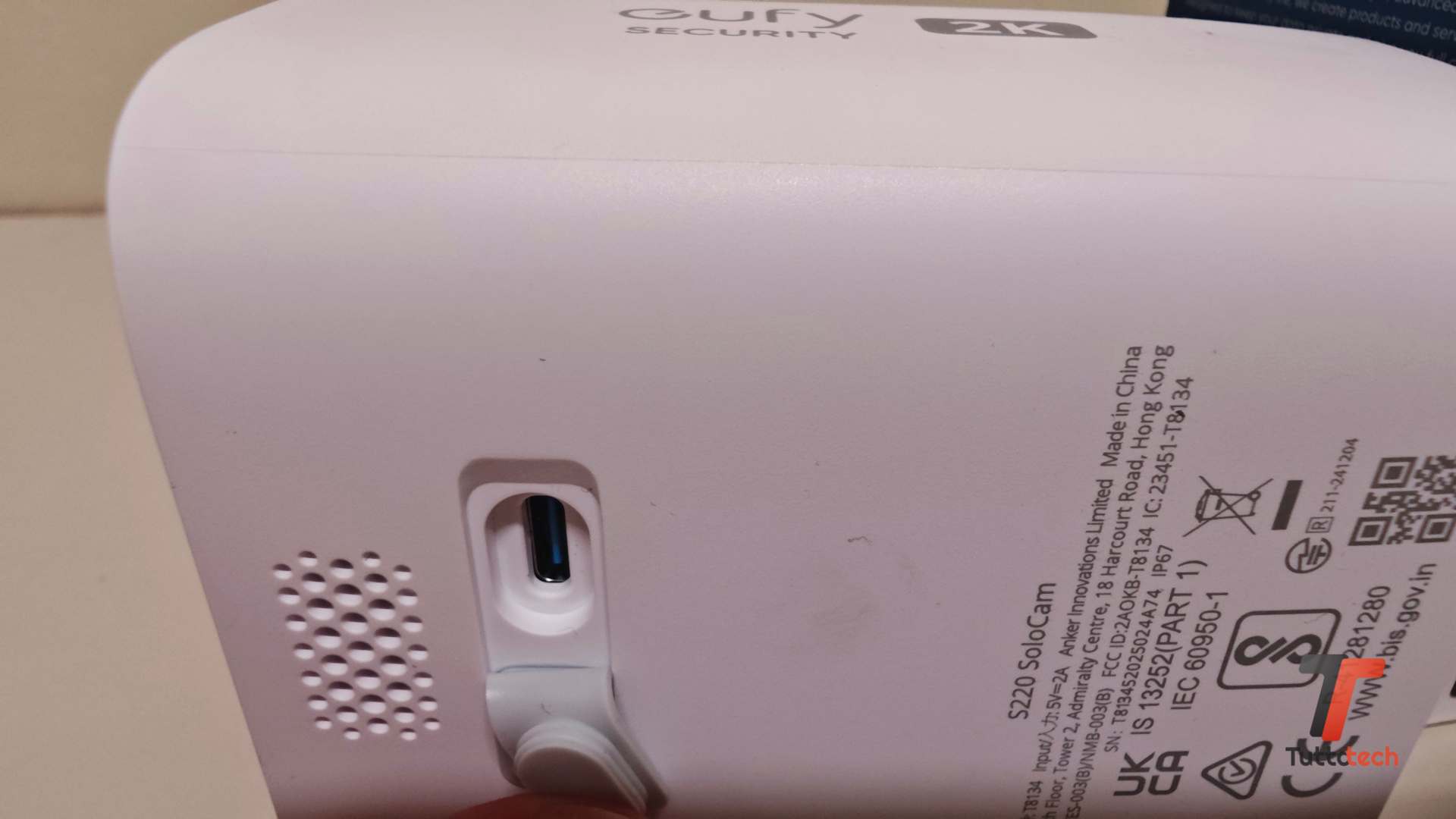 La natura outdoor di eufy SoloCam S220 di vede dalla presenza di un pannello solare nella parte superiore, così da poterla installare (utilizzando il supporto fornito in dotazione) senza dover utilizzare cavi di alimentazione. Sono sufficienti tre ore di luce solare, anche non diretta, per coprire una intera giornata e la batteria garantisce comunque due giorni di utilizzo senza ricarica. Va detto che se non attivate il rilevamento del movimento la telecamera entra in risparmio energetico, in modo da allungare l’autonomia. Anche nelle giornate piovose non abbiamo mai avuto problemi e abbiamo dovuto ricaricare manualmente la batteria solo utilizzandola come telecamera da interni (non si ricarica con la luce delle lampadine a LED).