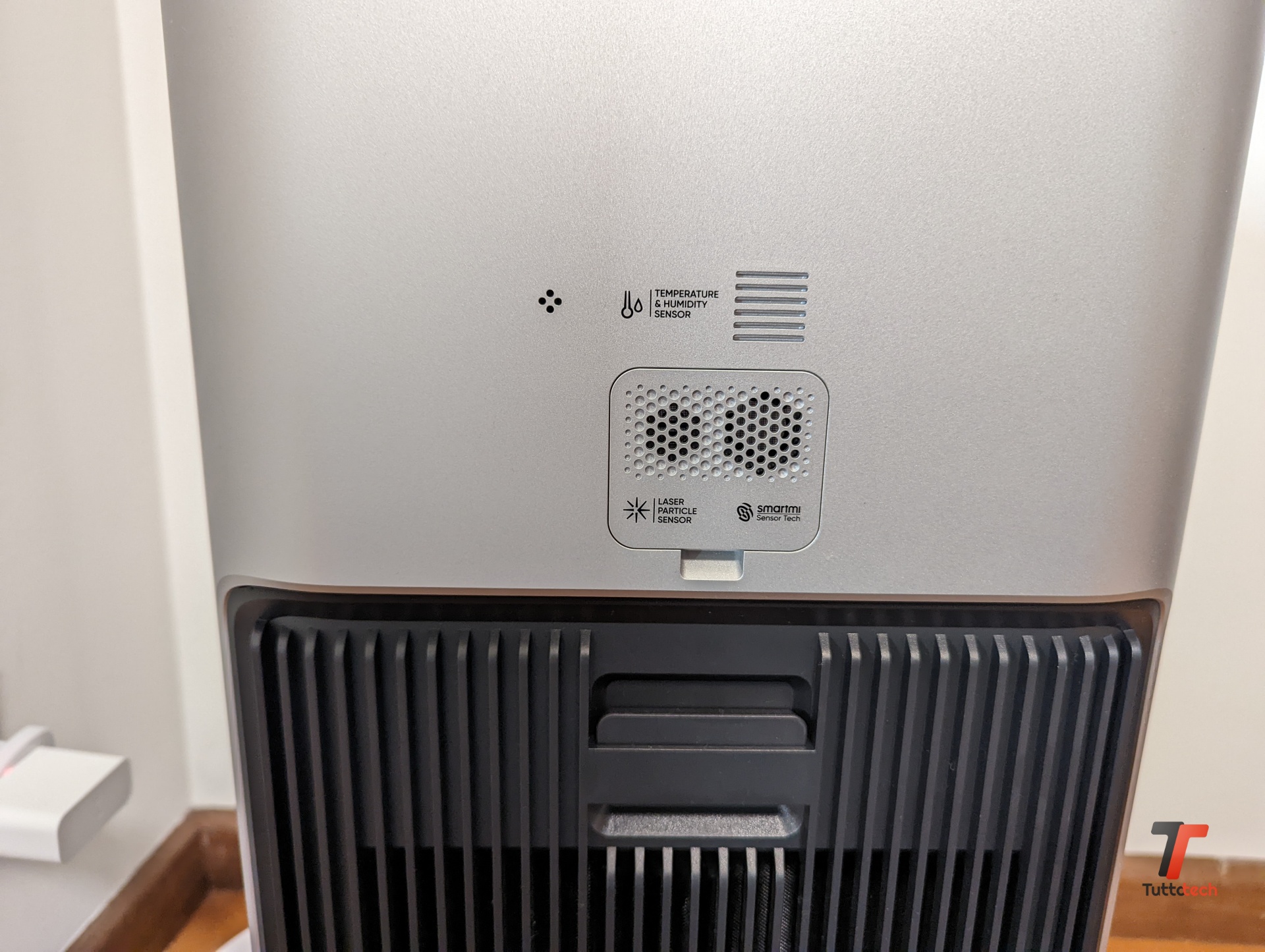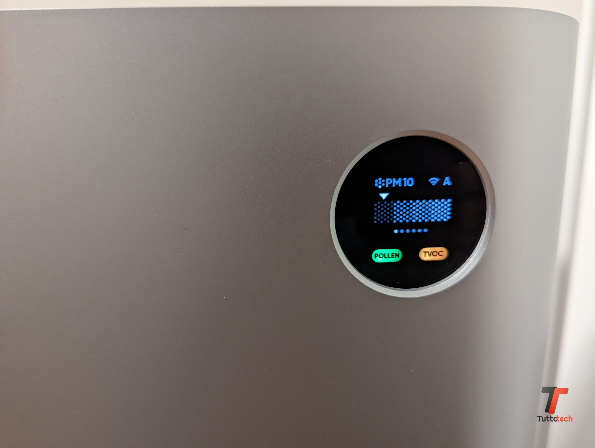 Per massimizzare l’efficienza della pulizia è presente una griglia superiore le cui lamelle possono essere orientate a 30-60-90 gradi, così da indirizzare il flusso d’aria in maniera migliore, senza mai risultare fastidioso per gli occupanti. Nella parte frontale è collocato uno schermo touch di tipo OLED, che permette di avere sempre sotto controllo la qualità dell’aria e di intervenire sulle impostazioni.