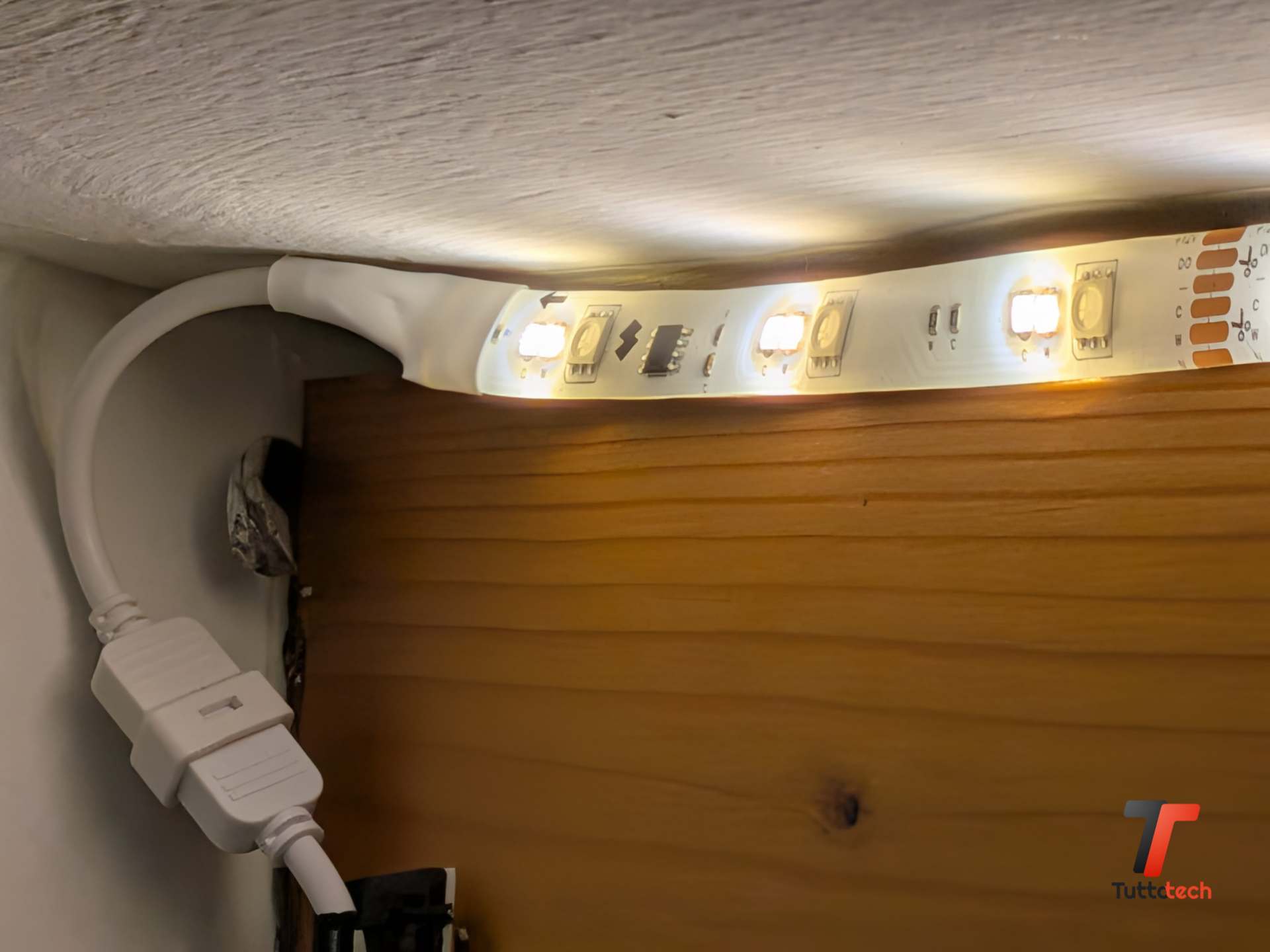 La striscia è ritagliabile (ogni 13 centimetri circa, 3 gruppi di LED) e ha una classificazione IP44, il che la rende utilizzabile anche in ambienti con qualche grado di umidità, come un bagno o uno spazio esposto a condensa. Con 1.200 lumen dichiarati, la luminosità in modalità bianca è genuinamente buona: sufficiente per illuminare uno spazio di lavoro come luce di riempimento, magari non come sorgente primaria, anche se il risultato è buono per illuminare bene una scrivania.