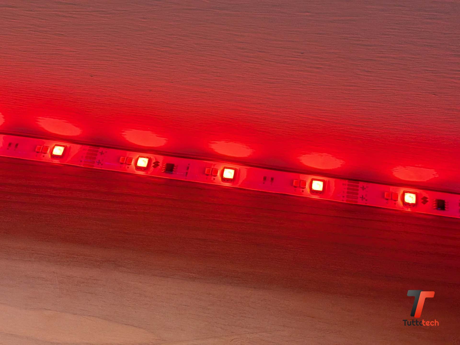 Il contro più rilevante da segnalare riguarda la visibilità diretta dei LED. I punti luminosi della striscia, se esposti alla visione diretta, possono generare riflessi fastidiosi su schermi monitor e superfici lucide. È un limite fisico della categoria, non un difetto specifico di questo prodotto, ma vale la pena dirlo chiaramente: SwitchBot RGBICWW Strip Light funziona al meglio quando è incassata, nascosta dietro un bordo, posizionata sotto un ripiano o comunque orientata in modo da non essere vista direttamente. In quella configurazione la luce diffusa è morbida e piacevole, esposta, con i LED a vista, può risultare scomoda in un ambiente di lavoro dove lo sguardo cade spesso sullo schermo.