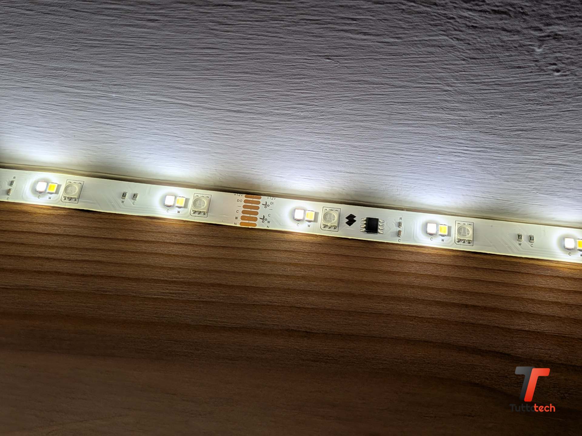 La striscia LED si presenta in una lunghezza da cinque metri, con una larghezza di dodici millimetri e un consumo di 24 watt. Il montaggio avviene tramite nastro biadesivo 3M già applicato sul retro, che si è rivelato sufficientemente resistente da non cedere neanche su superfici verticali dopo settimane di utilizzo.