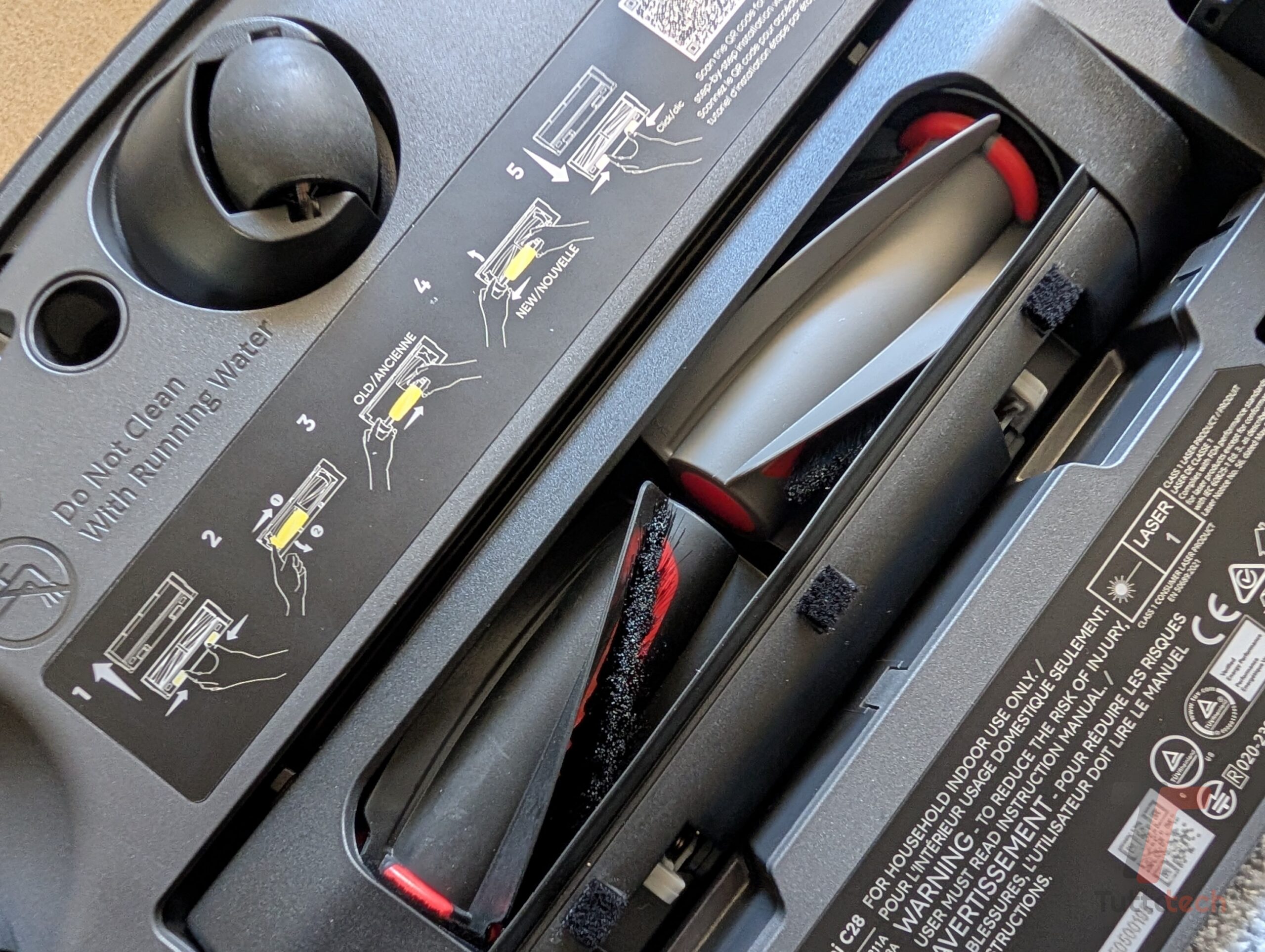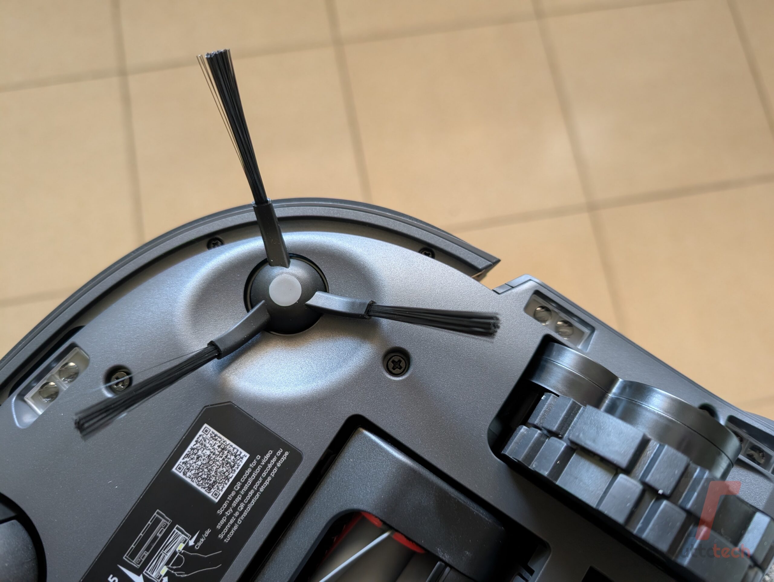 Il discorso da fare per lui sull’aspirazione è simile a quello fatto per il lavaggio e cioè lui aspira bene e tutto finché lo sporco sul pavimento non è incrostato, nel senso di attaccato e vecchio, altrimenti può capitare che lasci qualcosina in giro. Possiede una potenza di aspirazione di 15000 Pa che è sì inferiore a quella dei top di gamma del momento, che supera anche i 20000 Pa, ma è più che sufficiente per aspirare lo sporco che lui deve aspirare, sia sul pavimento che sui tappeti a pelo corto. Perciò lui aspira nel complesso bene ma così come tutti gli altri robot aspirapolvere, anche con oltre 20000 Pa di potenza, non è in grado di eliminare lo sporco attaccato al pavimento, che va rimosso manualmente. Escluse queste rare occasioni, lui lascia il pavimento sempre pulito ed elimina qualsiasi tipo di sporco superficiale senza alcuna difficoltà, anche perché la potenza di aspirazione è più che sufficiente per lasciare il pavimento pulito, anche con una sola passata. L’unica sua criticità sotto questo aspetto riguarda la pulizia negli angoli perché la spazzola laterale rotante destra che ha l’obiettivo di raccogliere lo sporco e spostarlo sotto la bocchetta di aspirazione non è estensibile e quindi lui non riesce a pulire negli angoli, come di mobili e muri, e negli spazi più stretti. In compenso, la spazzola laterale rotante sinistra è un buon aiuto nella raccolta dello sporco e la spazzola principale rotante DuoSpiral Detangle, che si occupa di raccogliere lo sporco in abbinata alla bocchetta d’aspirazione dell’aria, è divisa in due parti e fatta in modo da ridurre al minimo i grovigli: ed effettivamente abbiamo notato che se ne formano pochi e comunque la spazzola è facile da pulire e rimuovere per via della sua forma e dell’essere divisa in due pezzi.