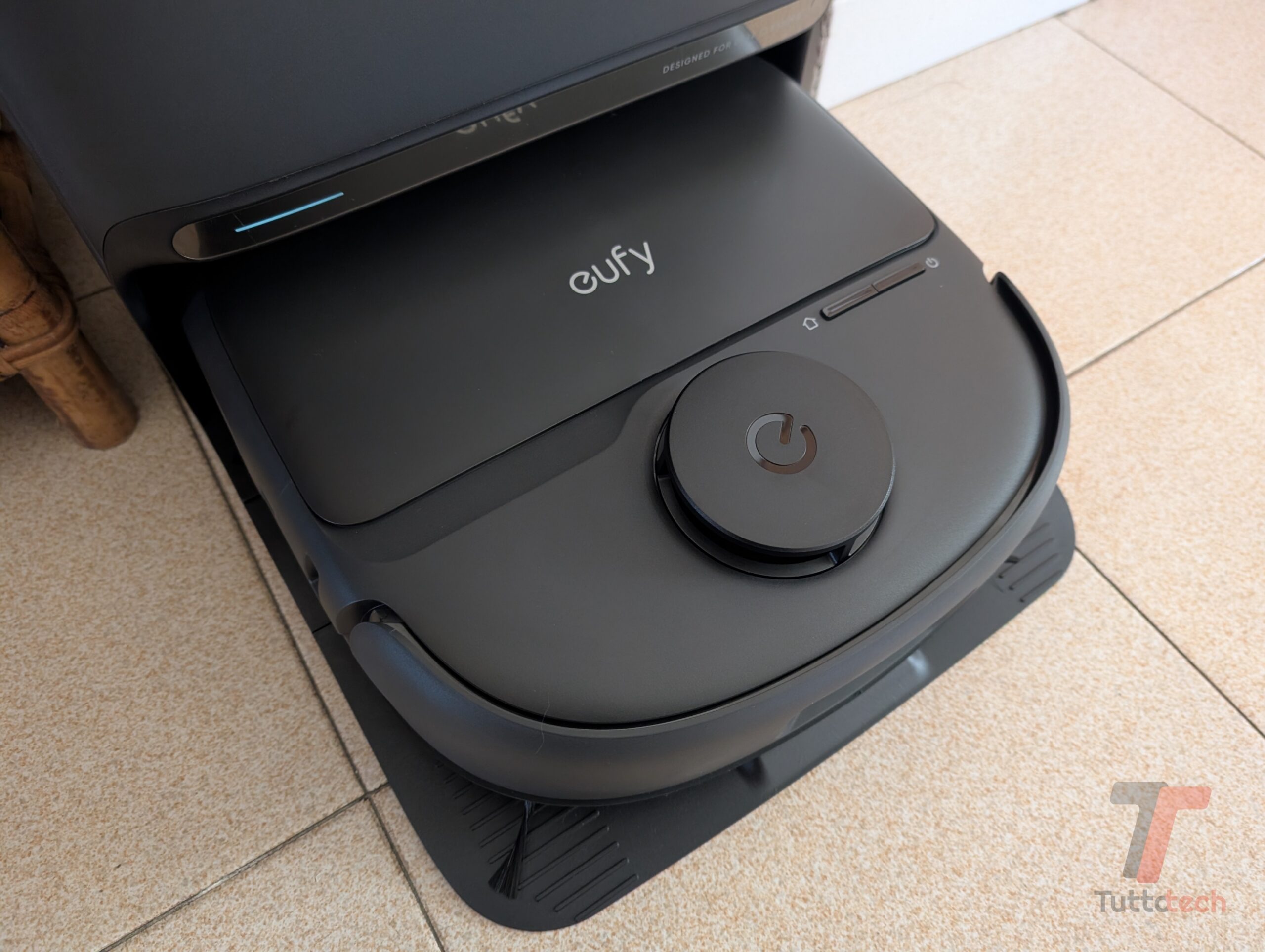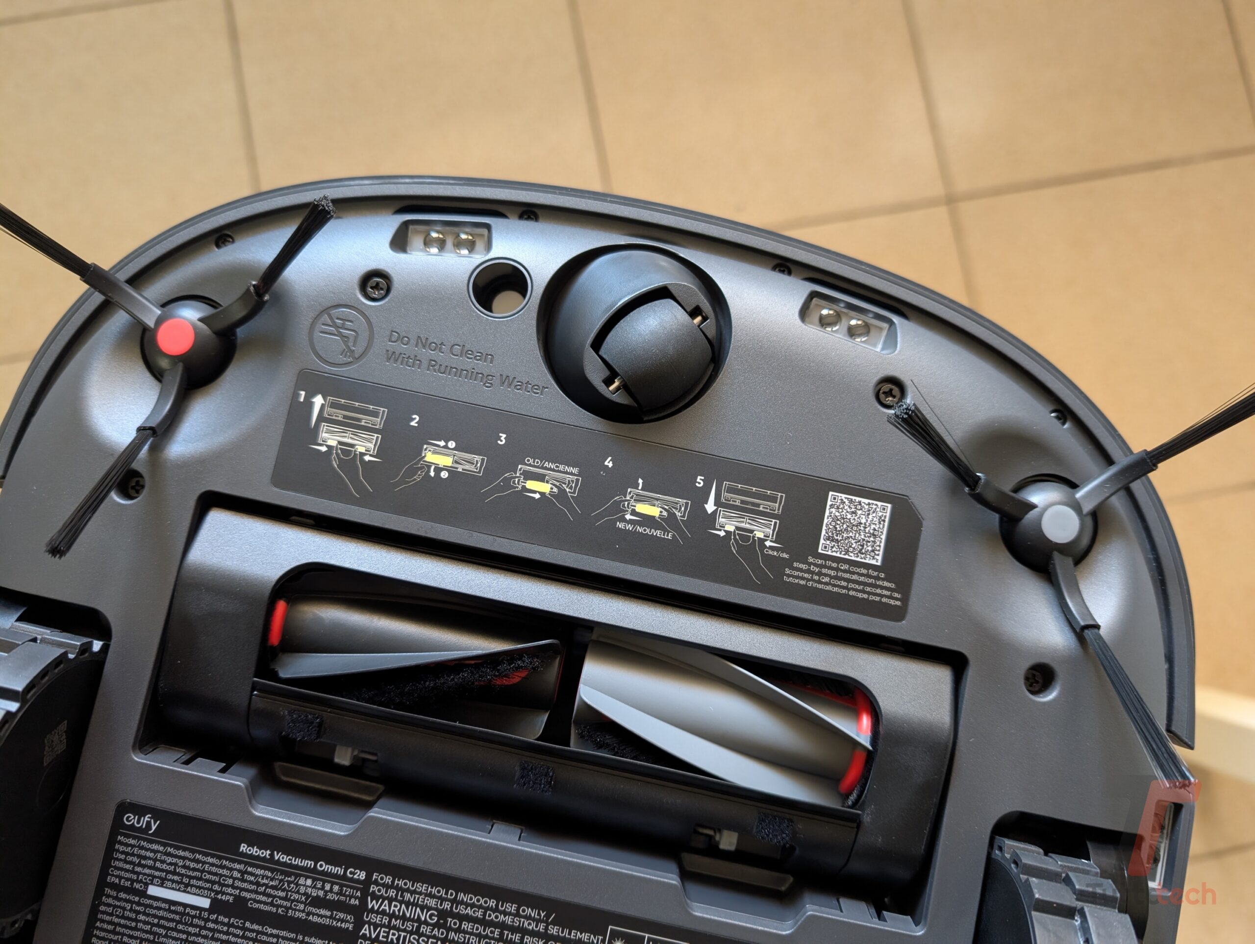Eufy Omni C28 è un robot che fa del lavaggio il suo punto di forza e questo è chiaro fin da subito per via del suo grosso rullo rotante installato nella parte posteriore, dove prende il posto dei ben più comuni moci di forma circolare. Lui è capace di spingere il rullo rotante sul pavimento con una forza fino a 1 Kg e di far sì che mentre ruoti inumidisca il pavimento con l’acqua pulita e in contemporanea elimini l’acqua sporca e lo sporco grazie al sistema HydroJet; così facendo ottimizza al massimo il processo di pulizia perché elimina qualsiasi tipo di residuo dal pavimento e nello stesso tempo fa sì che il rullo si lavi e sia sempre pulito espellendo l’acqua sporca e lo sporco nella vaschetta interna. E questa cosa gli permette di lavare con maggiore efficacia, più a fondo e di lasciare il pavimento sempre bello lucido dato che il rullo lava sempre con acqua pulita e senza sporco al suo interno. Pulisce bene e pulisce a fondo anche con una sola passata e riesce a lasciare il pavimento sempre pulito e brillante, almeno con i nostri scenari di utilizzo basati su un pavimento di piastrelle con sporco recente e superficiale. Può contare anche sul lavaggio automatico e sull’asciugatura con aria calda fino. 75° C tramite la stazione di ricarica, cosa fondamentale per eliminare odori e sporco. L’unico suo vero difetto nel lavaggio riguarda la mancanza dell’estensione del rullo: purtroppo il rullo è fisso e non si estende al di fuori del perimetro del robot, perciò non lava mai fino ai bordi dei piedi dei tavoli e delle sedie, dei muri e degli ostacoli in generale, lasciando sempre quel segmento di spazio di 4-5 cm.