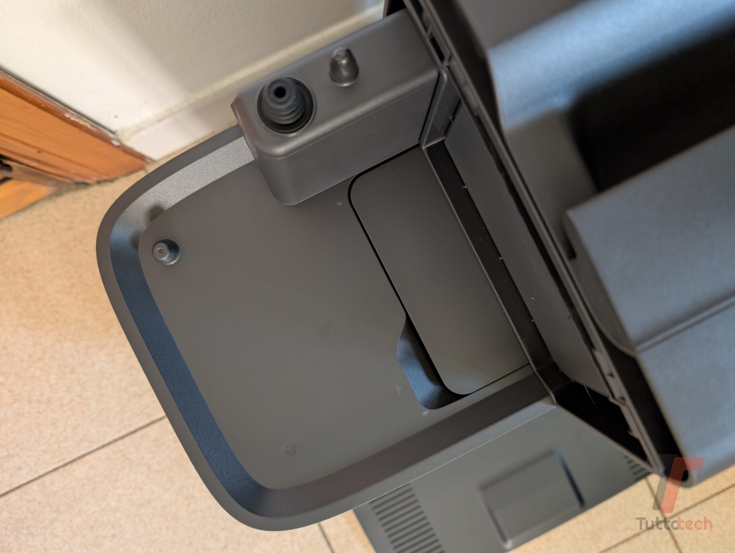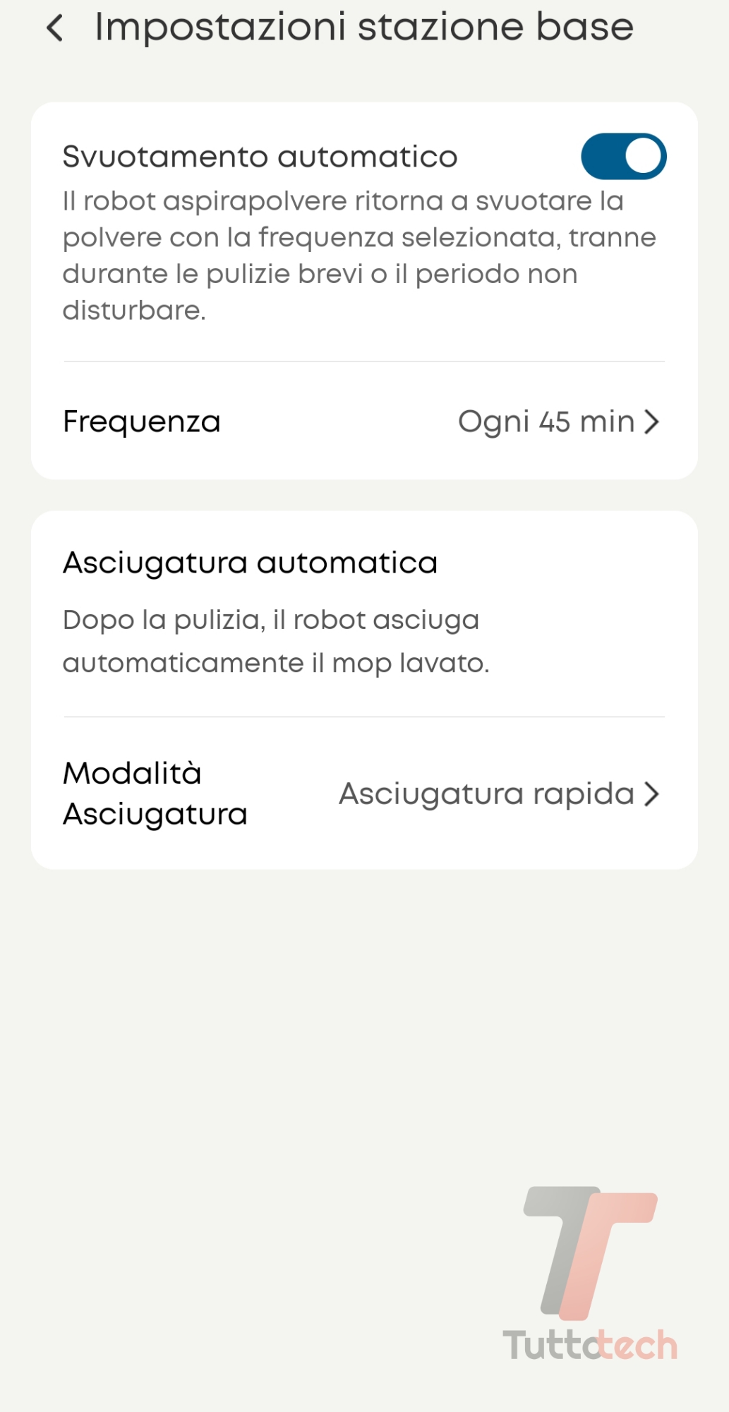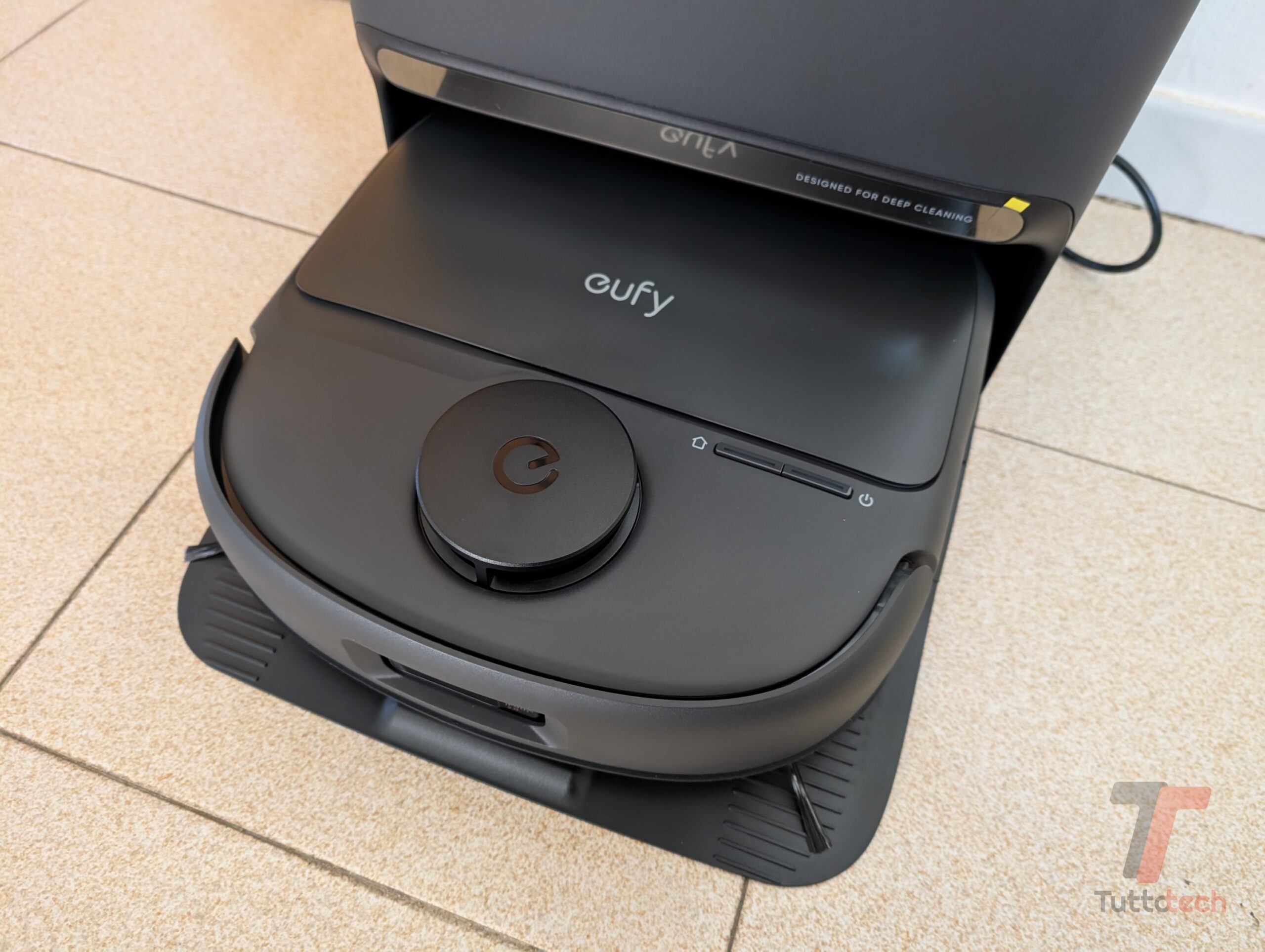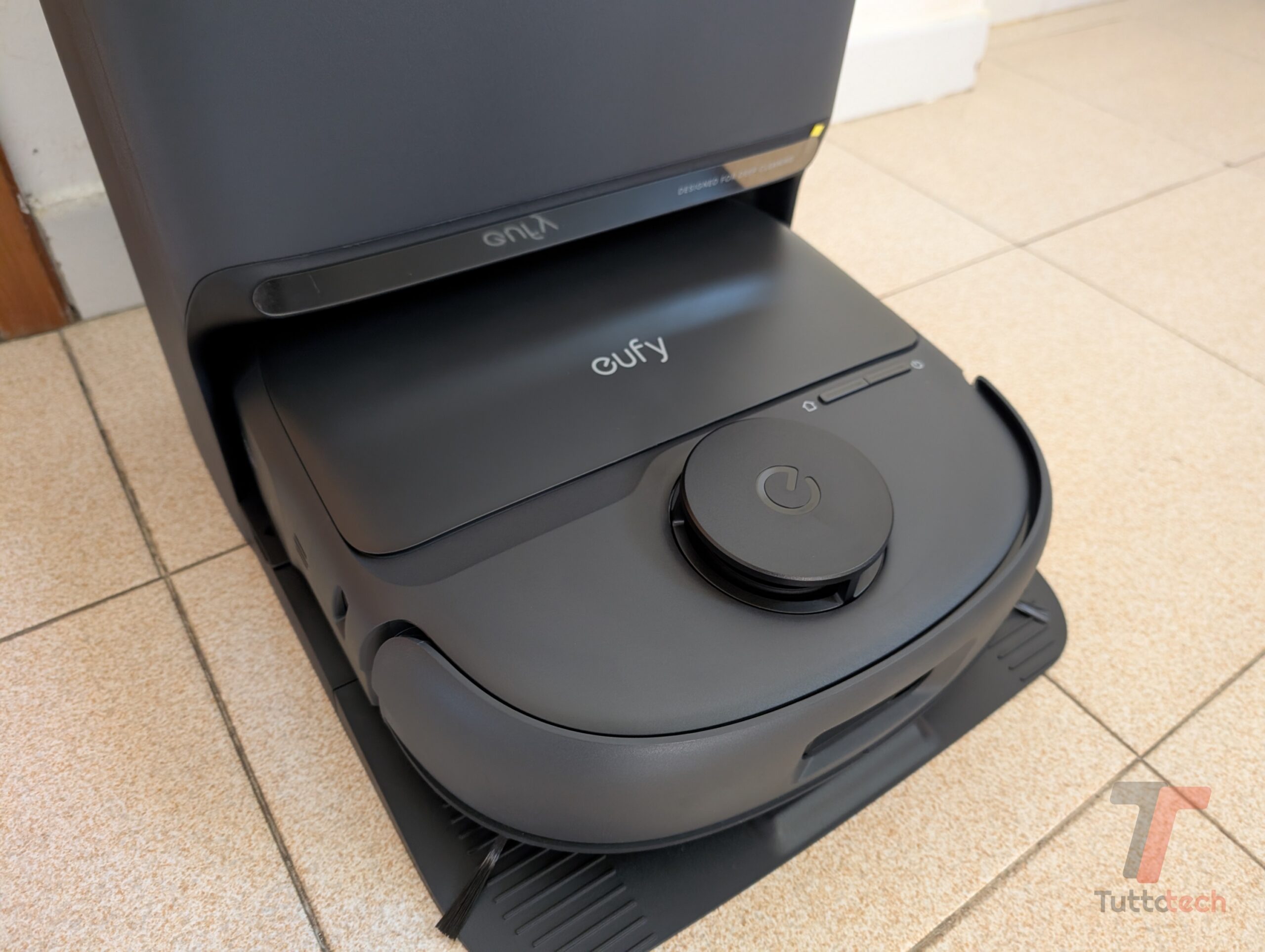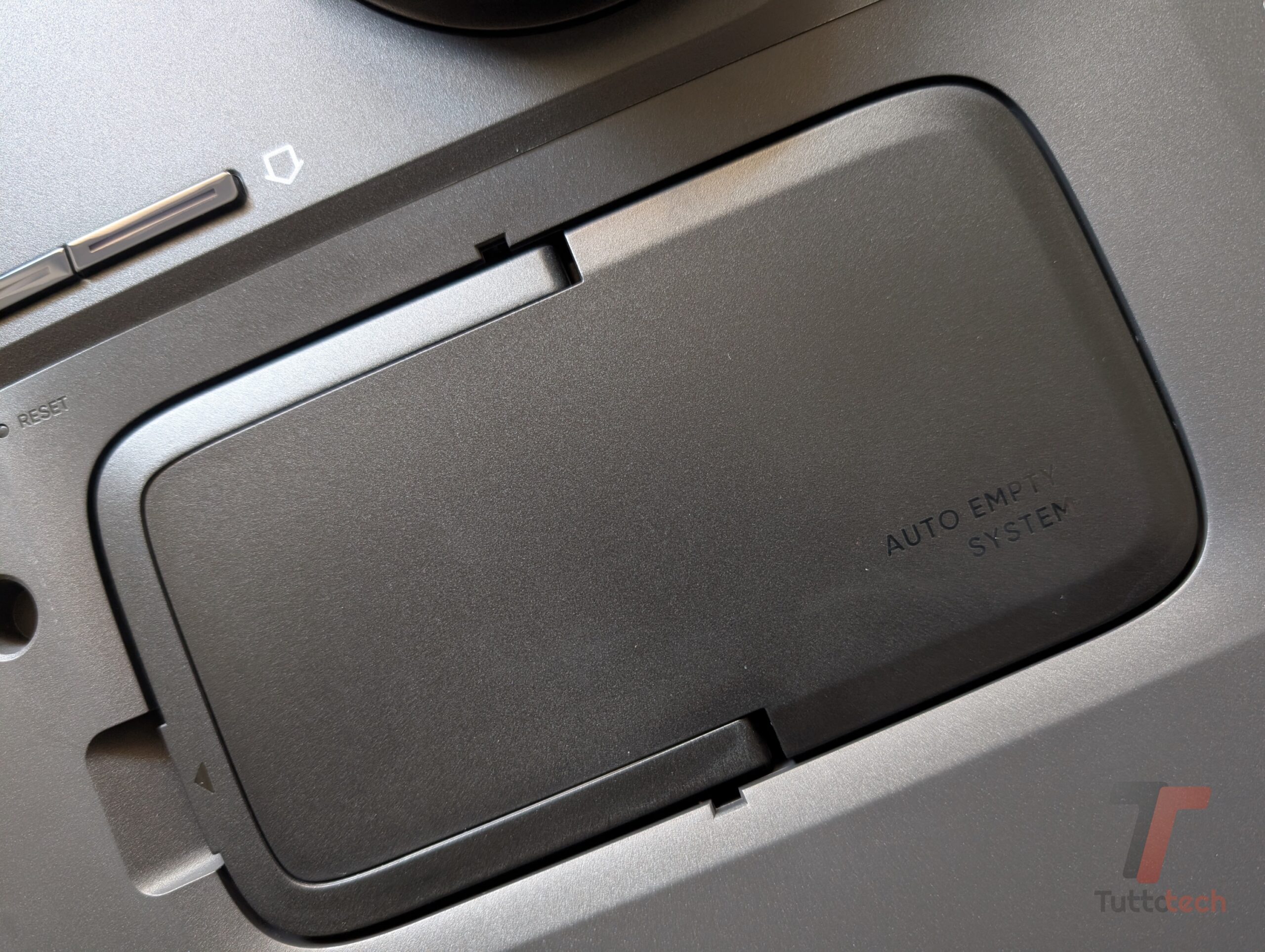 L’autonomia che lui offre non è di sicuro la più alta fra i robot attualmente in commercio, però garantisce 1-2 pulizie complete di qualsiasi ambiente casalingo di medie dimensioni; poi, come tutti gli altri, è capace di tornare alla base, ricaricarsi e tornare a pulire in modo autonomo quando si accorge che la batteria sta per esaurirsi. Questo è un aspetto più che mai personale, come ricordiamo sempre, perché è soggetto a decine di fattori, non solo a livello di impostazioni di pulizia ma anche di condizioni ambientali. Bene o male, da quello che abbiamo potuto vedere, la sua autonomia è in linea con quella di altri robot che abbiamo provato e riesce a pulire il nostro ambiente quasi per tre volte, il che ci lascia pensare che monti una batteria da 4000 mAh (l’azienda purtroppo non dichiara questo dato). La base di ricarica che lo accompagna è molto ben rifinita, piccolina e include le due vaschette per l’acqua sporca e pulita, nella quale aggiungere il detergente per i pavimenti, sopra, il sacchetto dello sporco nascosto nel vano frontale e le varie bocchette per l’acqua in entrata e in uscita e per svuotare in modo automatico lo sporco nel sacchetto. È una vera base 5 in 1 perché fa tutto in autonomia e riduce l’intervento manuale al minimo: svuota automaticamente lo sporco, lava e asciuga il rullo, ricarica l’acqua pulita, raccoglie l’acqua sporca e ricarica il robot, perciò è in grado di gestire il robot in totale libertà.