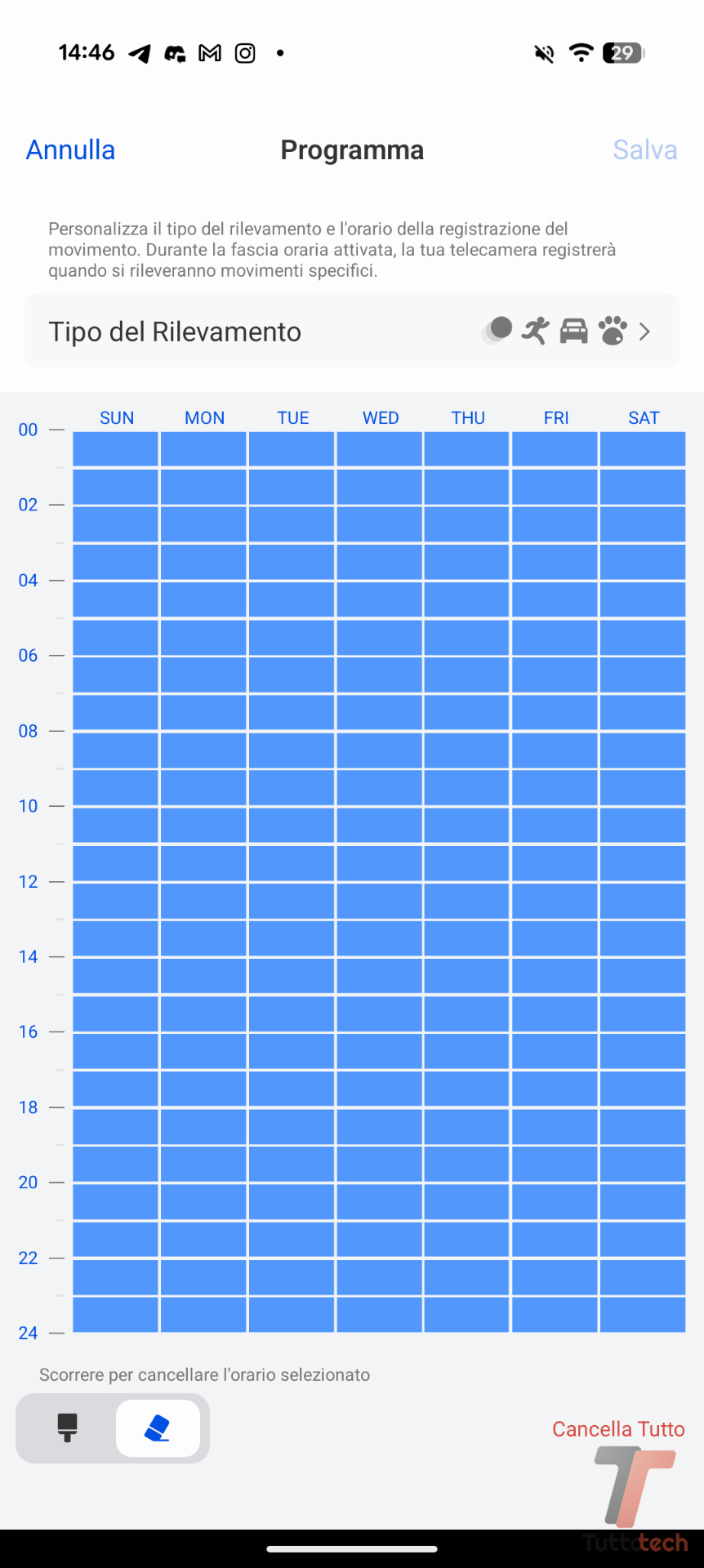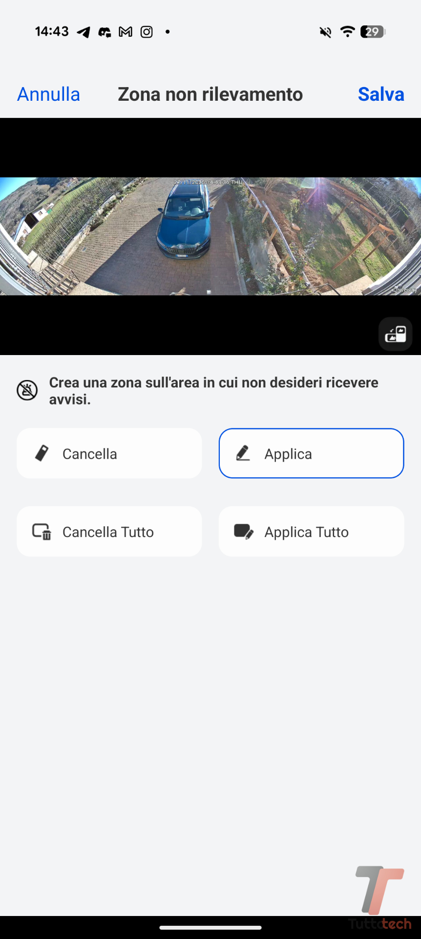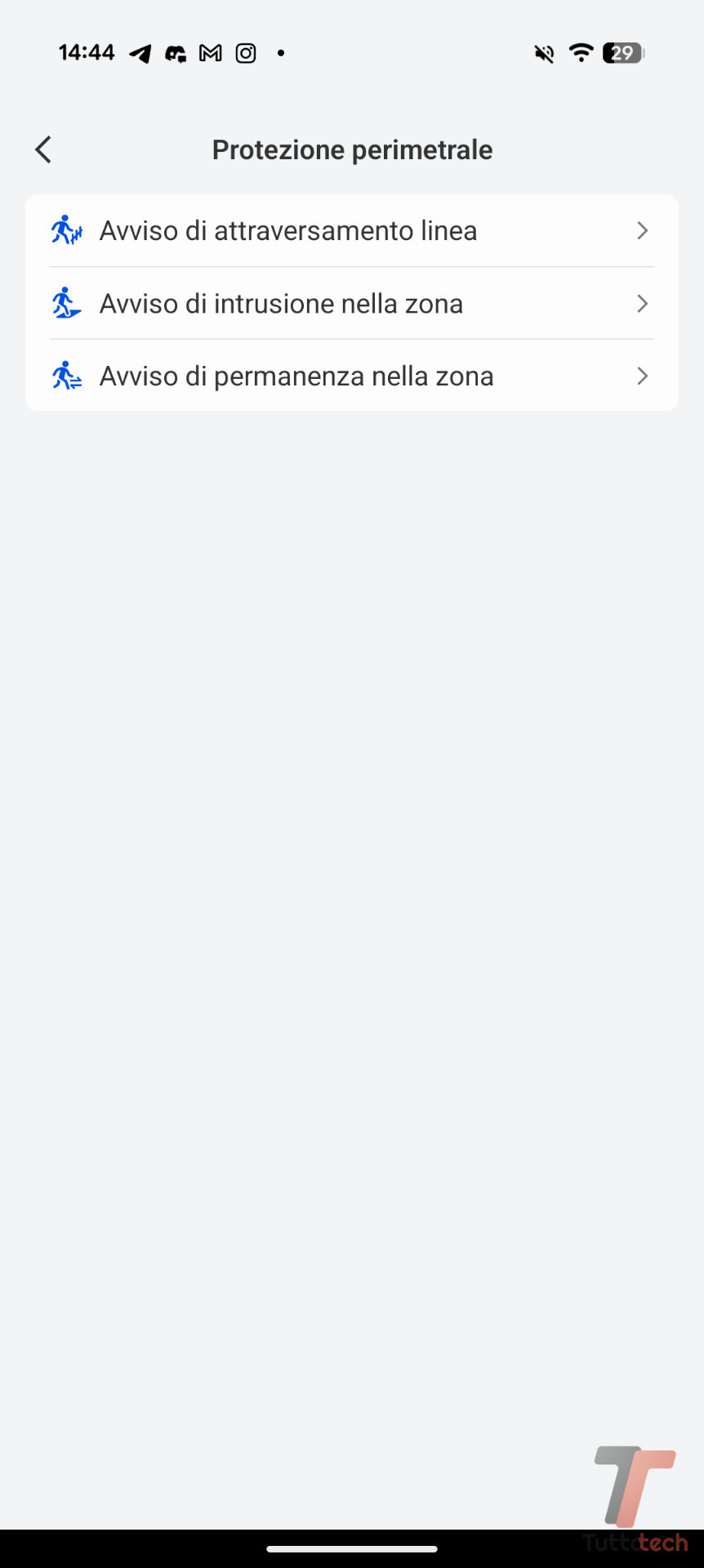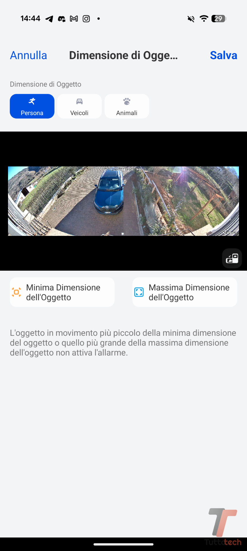 Dall’app si può regolare praticamente ogni aspetto: dal comportamento del rilevamento che genera notifiche e registrazioni, fino alla definizione delle aree in cui la videocamera non deve attivarsi. Si possono tracciare perimetri virtuali, configurare zone di attraversamento o di permanenza sospetta, regolare la sensibilità del sensore, introdurre un ritardo prima della registrazione o dell’allarme e persino filtrare gli eventi in base all’oggetto rilevato: persone, animali, veicoli o oggetti generici.