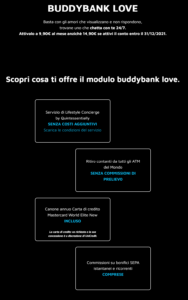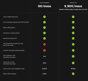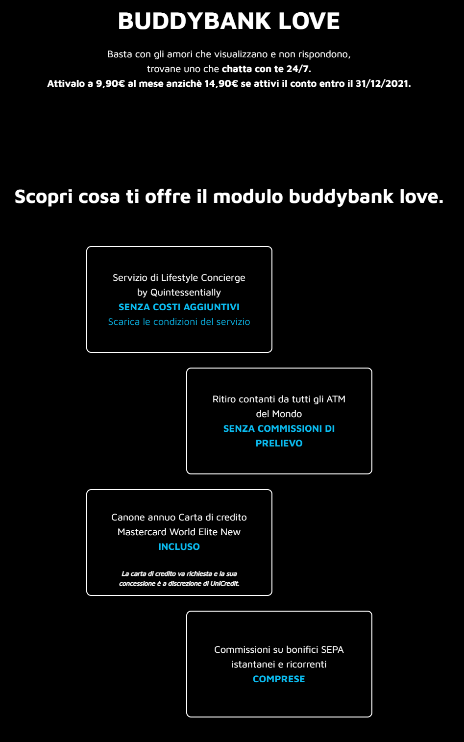 La carta di credito World Elite New ha un costo di emissione di 10€ e un canone mensile di 10€, per un totale di 120€ all’anno. I clienti buddybank che attivano il modulo LOVE però hanno diritto alla carta World Elite New gratuitamente. Anche in questo caso l’emissione è a discrezione dell’istituto UniCredit, dopo valutazione del merito creditizio e della documentazione redditizia accessoria da inviare al momento della richiesta, che si può fare comodamente tramite app. Per maggiori informazioni la scheda prodotto è disponibile qui.