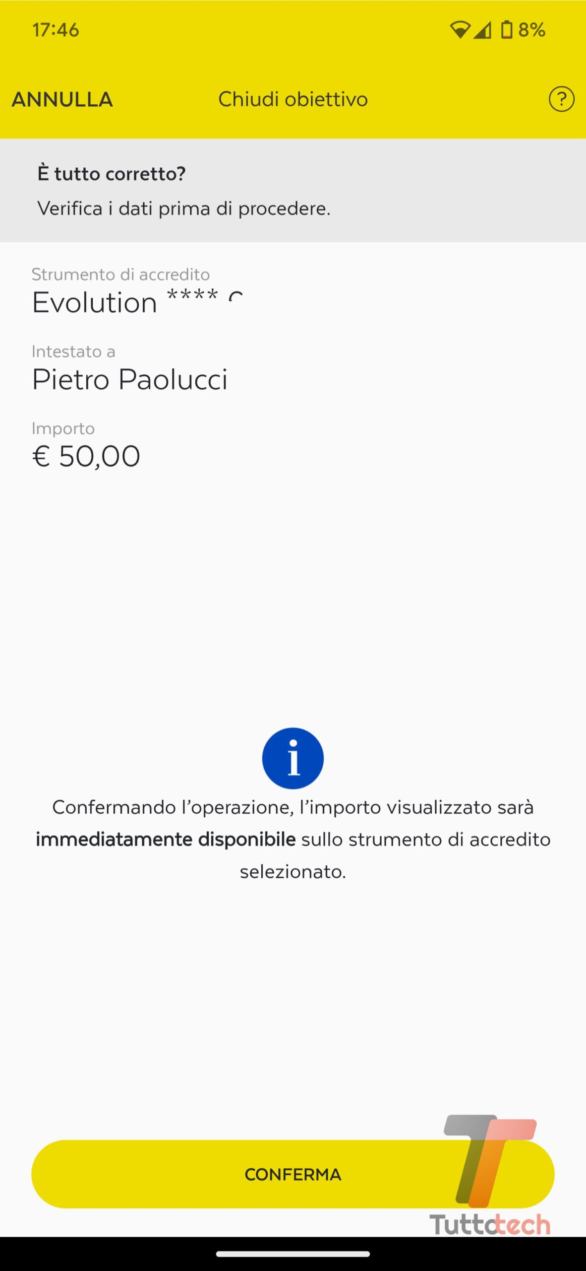 In caso di urgenze e anche nel caso in cui l’obiettivo di risparmio non sia raggiunto, è sufficiente inoltre impostare come data di scadenza dell’obiettivo il giorno stesso in cui lo si crea o, per trasferire denaro immediatamente basta chiudere l’obiettivo seguendo questo semplice percorso: Salvadanaio > Il proprio obiettivo > Chiudi obiettivo. A questo punto l’app ti chiederà soltanto su quale strumento effettuare il versamento (Libretto Smart o la stessa Postepay Evolution da cui hai impegnato l’importo) e di confermare l’operazione di accredito: l’importo sarà disponibile subito.