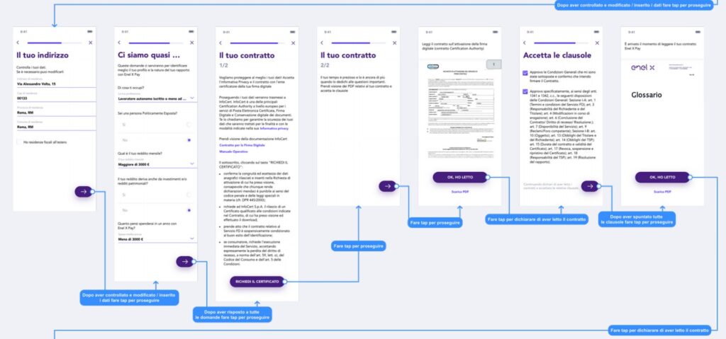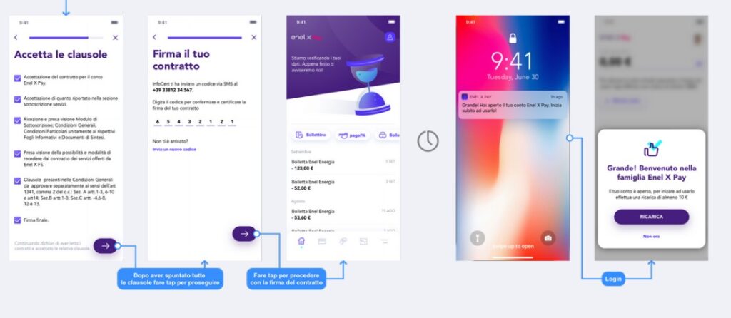 Potrebbe essere richiesto di fissare una videochiamata con un operatore per validare l’operazione: un operatore Infocert si occuperà di controllare dati e documenti, e alla fine avrete il conto aperto. In alternativa, potrebbe essere richiesto il certificato per la firma digitale Infocert: il sistema invierà un codice via SMS da utilizzare nello step successivo, dopo aver visualizzato i documenti relativi al conto Enel X Pay e accettato le clausole del contratto.