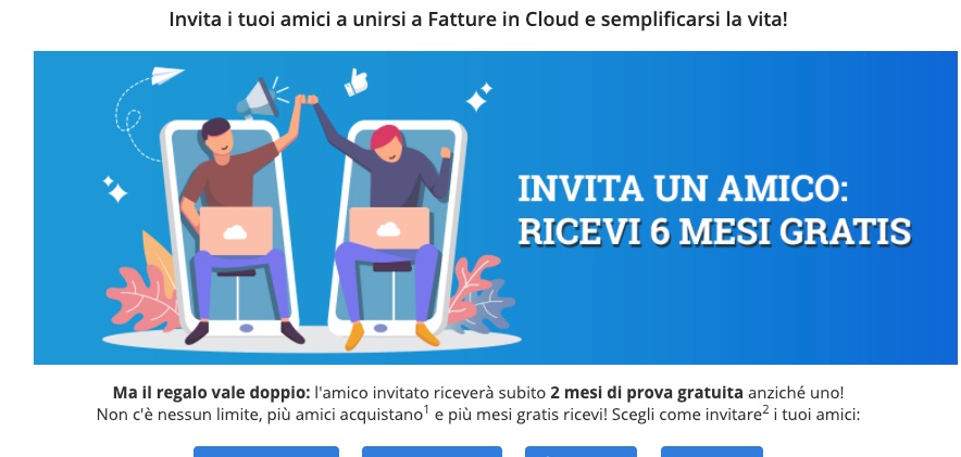 Qual è il costo Fatture in Cloud? Sono presenti tre piani in abbonamento, a seconda delle esigenze dei singoli professionisti o aziende, ma il costo è per tutti inferiore ad un caffè al giorno. I primi 31 giorni sono gratis e senza impegno, e permettono di provare estensivamente i servizi di Fatture in Cloud, così da poter valutare l’efficacia del servizio. Registrandosi al servizio tramite questo link è possibile prorogare a due mesi la prova gratuita, raddoppiano il vantaggio iniziale e risparmiando un mese di abbonamento. Possiamo anche invitare i nostri amici e colleghi a provare il servizio tramite link d’invito: così facendo potremo ottenere per noi fino a 6 mesi di abbonamento gratuiti, mentre il nostro amico trarrà vantaggio di due mesi di prova gratuita del servizio.