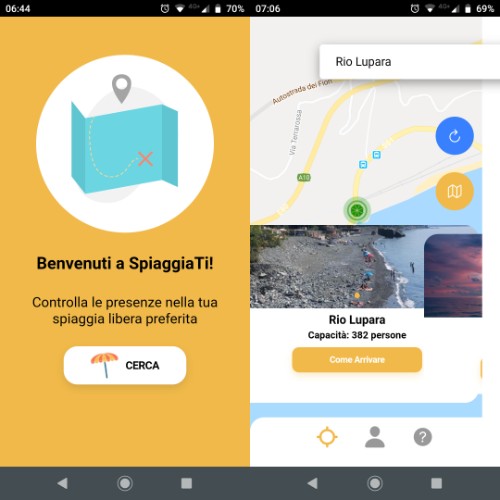 L’app SpiaggiaTi (AndroidiOS) consente di controllare in tempo reale le presenze nelle spiagge libere della Liguria. Una volta scaricata è sufficiente pigiare sul tasto Cerca e selezionare una delle quattro province della Regione per vedere lo stato di presenze in una determinata spiaggia.