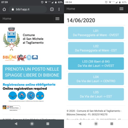 La WebApp Bibi1App consente di prenotare la spiaggia libera attrezzata di Bibione, previa registrazione online al portale. Le zone disponibili sono Pineda, Lido del Sole, Zona Terme, Zona Firmamento, Zona Zenith e Lido dei Pini. A differenza della spiaggia di Jesolo, è possibile prenotare anche in giornata. I posti liberi sono contrassegnati in verde.
