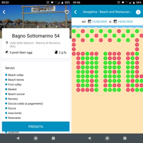 Dopo l’installazione l’app chiede di selezionare il giorno per cui si richiede un posto in spiaggia (se si sceglie lo stesso giorno il sistema blocca in automatico la richiesta). Nella schermata successiva, l’app mostra un’ampia selezione di aree attrezzate, indicando la posizione sulla spiaggia (numero fila ombrelloni) e il prezzo richiesto.