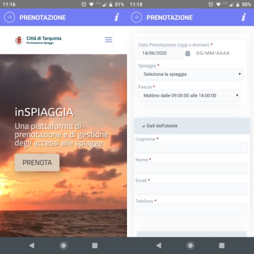 L’app inSpiaggia (Android) è la piattaforma del comune di Tarquinia per prenotare le spiagge libere presenti lungo la costa, ad eccezione della rinomata spiaggia di Montalto di Castro per cui l’accesso sarà libero fino a esaurimento posti. La prenotazione (previa registrazione) è disponibile soltanto per il giorno stesso o l’indomani e va indicata anche la fascia oraria (mattino, pomeriggio o giornata intera).
