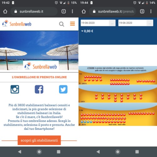 Sunbrellaweb (link alla homepage) è una delle WebApp più gettonate per prenotare ombrellone con sdraio in uno degli oltre 3.800 stabilimenti disponibili. L’interfaccia è molto intuitiva: si seleziona lo stabilimento, la data e la disponibilità di posti; quindi si passa alla prenotazione: i costi di transazione vengono prelevati subito dalla carta, mentre il pagamento per il servizio balneare è da effettuare al momento del check-in.