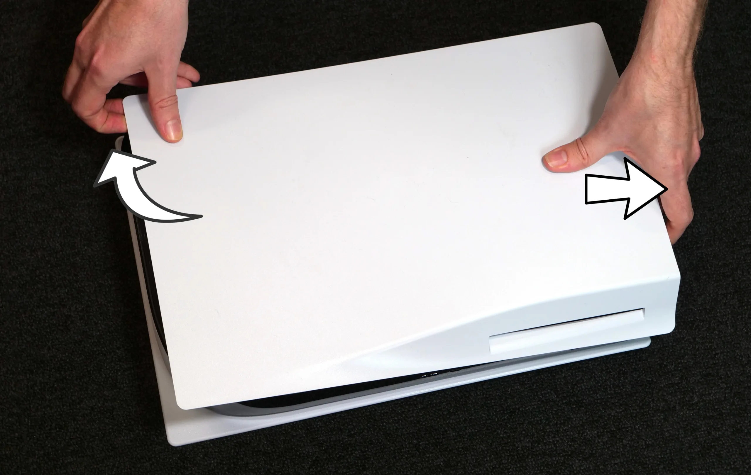 Vista dall’alto la console sembra granitica: per aprirla posizioniamo entrambe le mani sugli angoli del pannello. Con la mano destra alziamo di poco il pannello, mentre con l’altra mano tentiamo di far scivolare il pannello verso il lato esterno, così da esporre lo chassis della console.