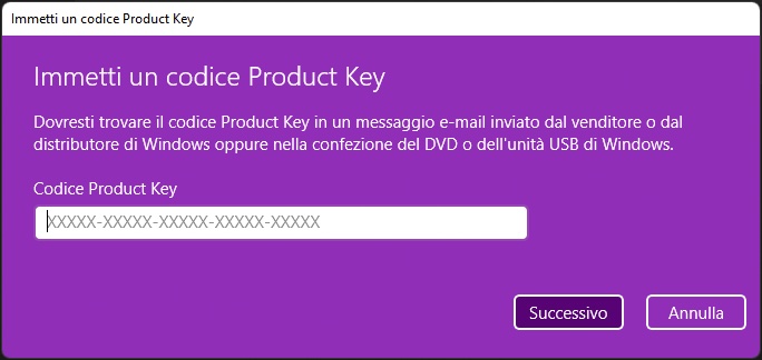Il codice viene solitamente richiesto in fase di installazione, ma se ciò non accade dovremo immettere il Windows 11 Product Key manualmente, una volta terminata l’installazione: