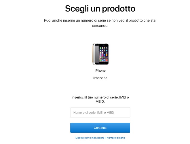 - Inserisci il tuo numero di serie, IMEI o MEID, nel campo apposito e fai clic sul pulsante Continua per proseguire*;