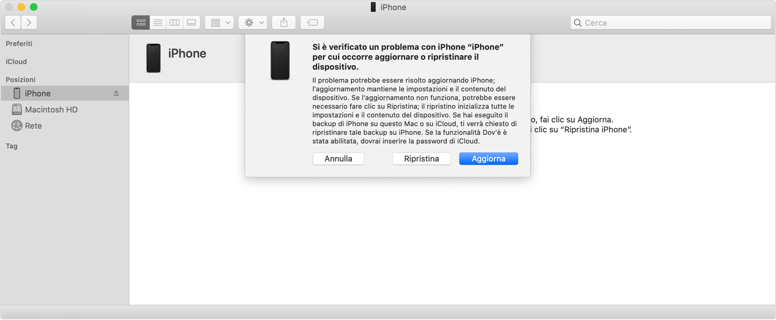 - Su iTunes o Finder dovremo vedere una schermata che ci chiederà di aggiornare o ripristinare il dispositivo: scegliamo Aggiorna;