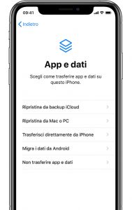 • A questo punto ci troveremo davanti la schermata App e Dati: da qui potremo decidere di ripristinare il nostro iPhone con un backup effettuato in precedenza;