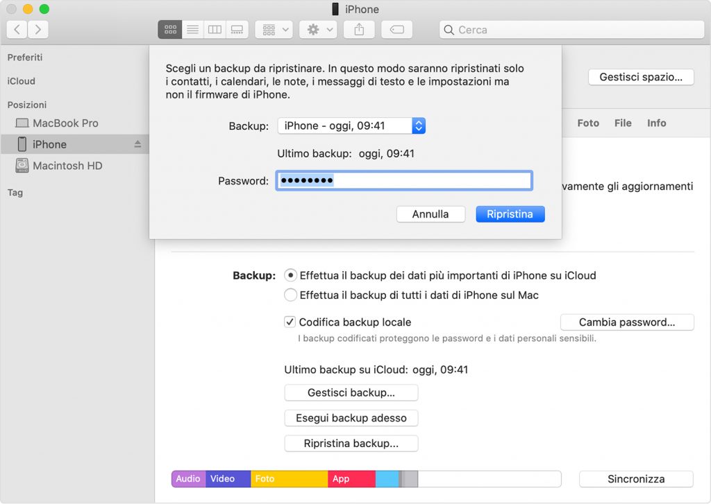 Se disponiamo di una connessione ad Internet particolarmente lenta oppure non abbiamo spazio a sufficienza su iCloud per contenere tutti i nostri dati, e non avete intenzione di pagare un abbonamento per aumentare lo spazio di archiviazione a disposizione, allora il backup offline su PC e Mac è l’alternativa migliore. A differenza del backup su iCloud, che è codificato di default, l’operazione di ripristino backup da Finder potete decidere se codificare o meno il backup: se decidete di farlo, allora dovrete anche ricordare la password da utilizzare per il ripristino, altrimenti non sarete in grado di completare la procedura.