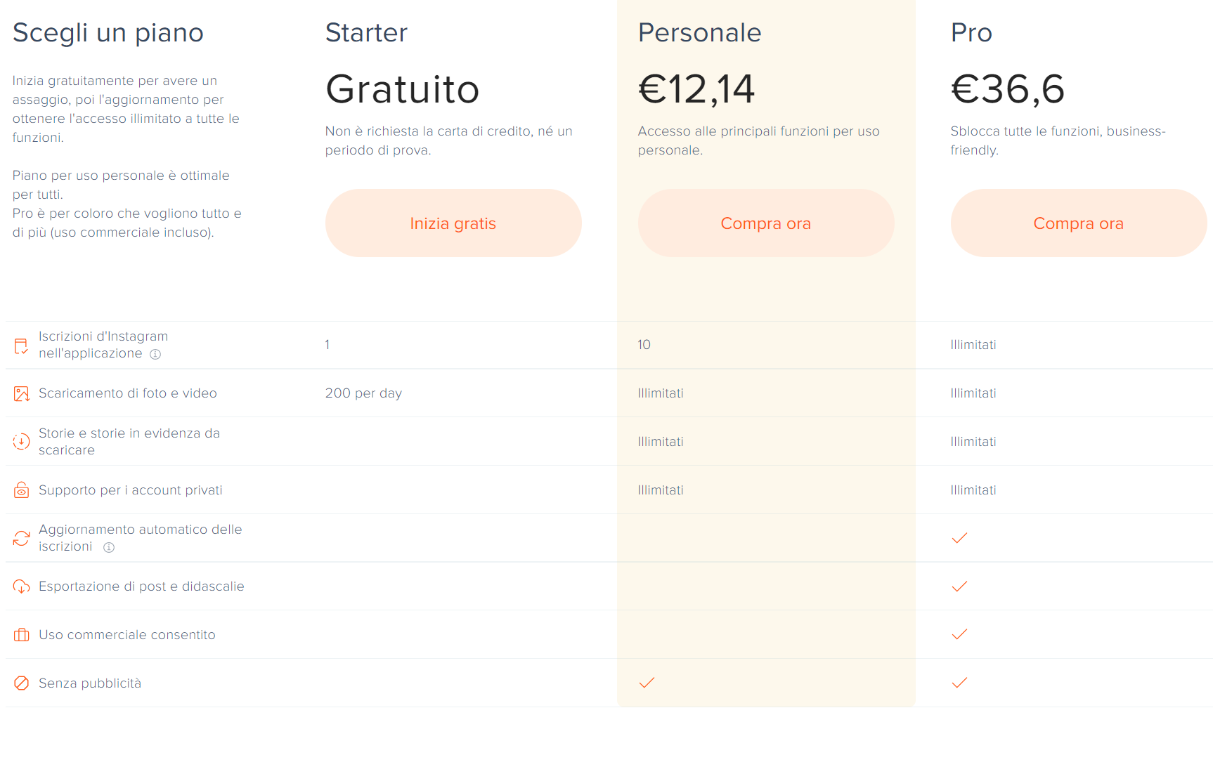 Con il piano gratuito possiamo effettuare il download di foto su Instagram selezionandole una alla volta, fino a 200 al giorno, e registrare un solo account. Già con il piano Personale, dal costo di 12,14€, possiamo scaricare foto, video e storie in modo illimitato, e registrare fino a 10 account nell’applicazione: in questo modo potremo anche fare il download di contenuti dagli account dei nostri amici o dei nostri clienti, ad esempio. Il piano Pro infine è orientato ad un’utenza business, tanto che abilita all’utilizzo dell’applicazione per scopi commerciali.