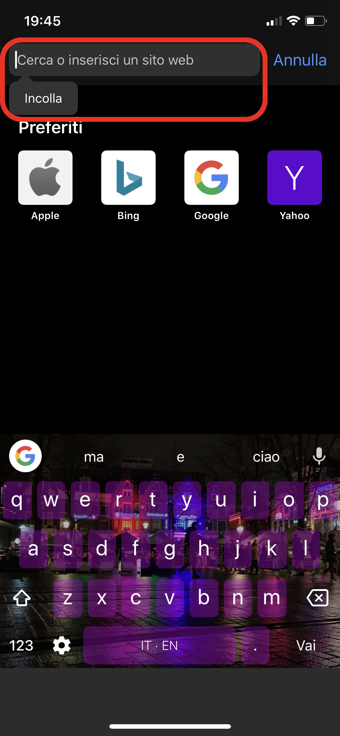 - Tenere premuto a lungo sul campo indirizzo e selezionare incolla dal sottomenu