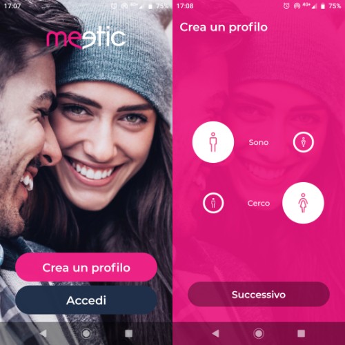 La registrazione a Meetic richiede pochi minuti. Se volete usare il sito d’incontri su telefono, scaricate per prima cosa l’app (link Android – link iOS). Terminata l’installazione pigiate su Crea un profilo, selezionate il vostro genere e se cercate un uomo o una donna; compilate poi i campi Città, Codice postale, Regione e Paese, inserite la data di nascita e il vostro nome (soltanto il nome); infine inserite email e password, che saranno le credenziali con cui effettuerete l’accesso, e pigiate sul bottone Fine.