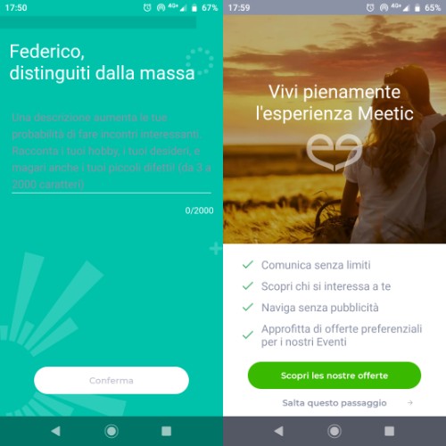 Gli iscritti oltre ad avere un nome e un volto hanno anche un profilo con una descrizione approfondita e puntuale, rendendo agli altri utenti più semplice la ricerca di un profilo idoneo per iniziare quantomeno una chat esplorativa. Su Meetic l’interesse per una persona piuttosto che un’altra nella maggior parte dei casi non dipende da una foto profilo in evidenza ma da come ci si presenta a parole. Già da solo questo elemento porta la conoscenza iniziale a un livello superiore.