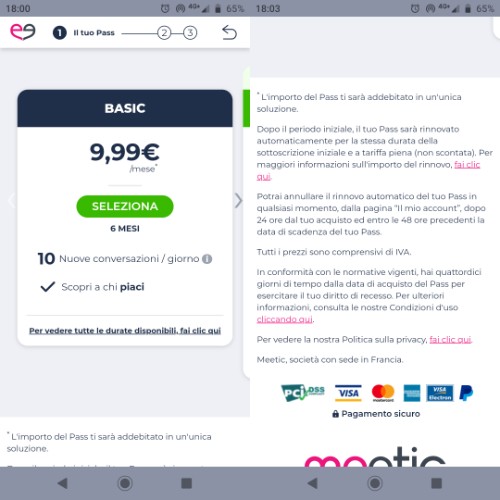 Esistono tre tipi di abbonamento. Il piano Basic costa 9,99 euro al mese per un totale di 6 mesi e dà la possibilità di contattare senza limiti fino a un massimo di 10 persone nuove ogni giorno. L’abbonamento Scoperta ha un prezzo di 12,99 euro al mese e permette di conoscere fino a 25 persone al giorno. Infine il piano Illimitato a 14,99 euro al mese propone conversazioni illimitate e la rimozione dei banner pubblicitari.