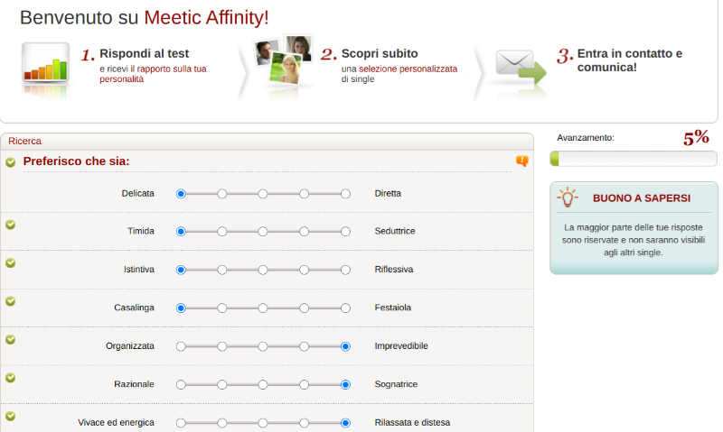 Meetic Affinity è a tutti gli effetti un altro sito di dating che rientra nello stesso gruppo di Meetic.it (Match Group). Una volta collegati alla homepage dovete rispondere a un questionario sulla personalità a cui siete più interessati. Il test richiede diversi minuti, prendetevi quindi un po’ di tempo del vostro tempo libero per rispondere a tutte le domande che vertono su: Ricerca, Visione della coppia, Personalità, Gusti e Valori.