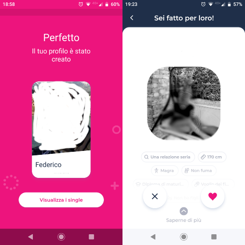 Dopo pochi minuti il vostro profilo/annuncio sarà pronto. D’ora in avanti potrete iniziare a trovare nuovi single pigiando sul tasto Visualizza Single. Nella sezione Sei fatto per loro! Corrispondi ai loro criteri vengono visualizzati i profili più affini in base alla descrizione e alle risposte fornite durante il primo questionario.