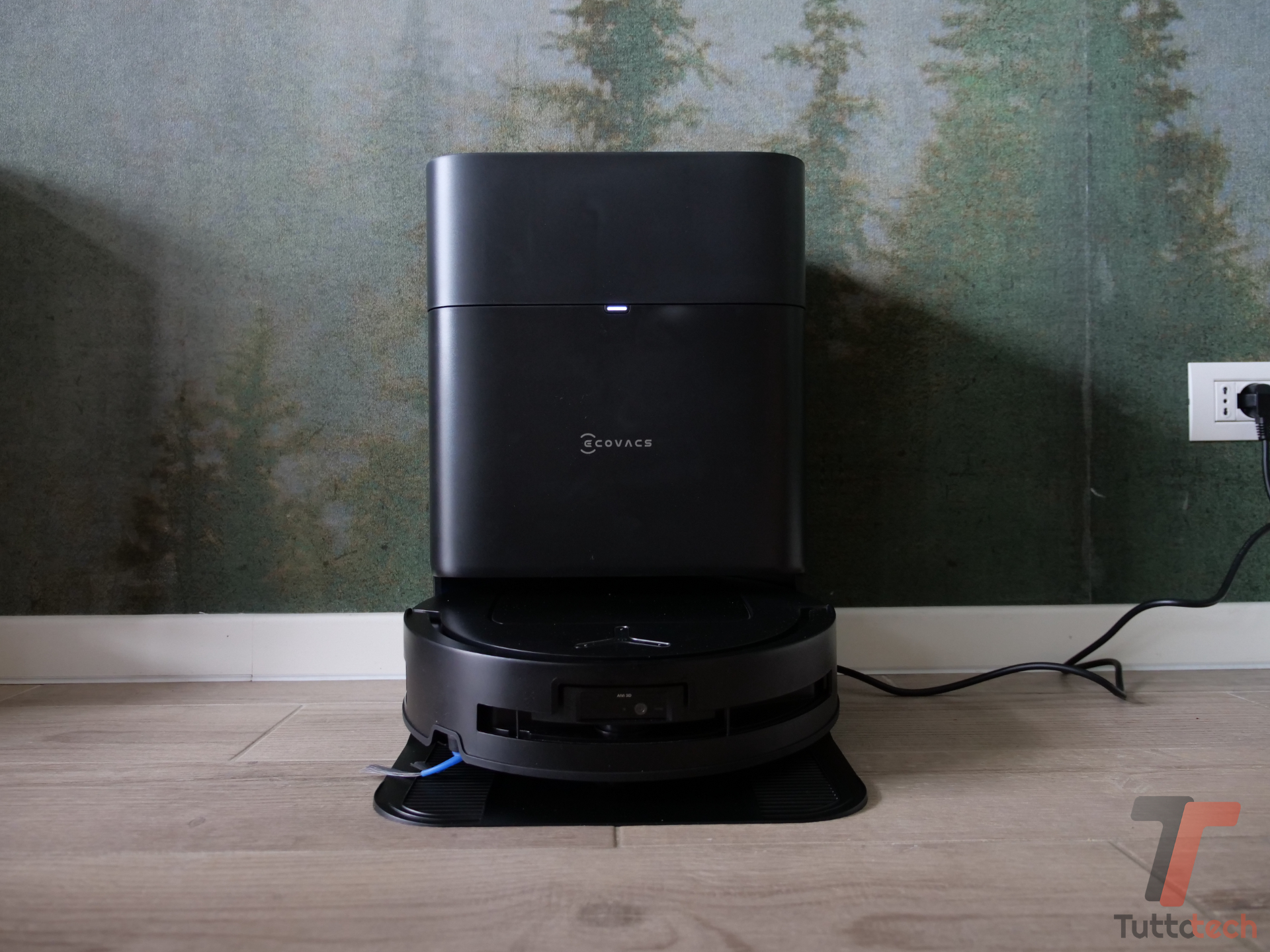 La stazione di svuotamento automatico, priva di sacchetto, utilizza la tecnologia PureCyclone con un sistema di filtraggio a 4 stadi, garantendo una raccolta efficiente della polvere senza perdita di aspirazione. Il sistema di lavaggio OZMO consente di regolare il flusso d'acqua per una pulizia personalizzata, mentre la compatibilità con l'app ECOVACS HOME permette un controllo completo del dispositivo.