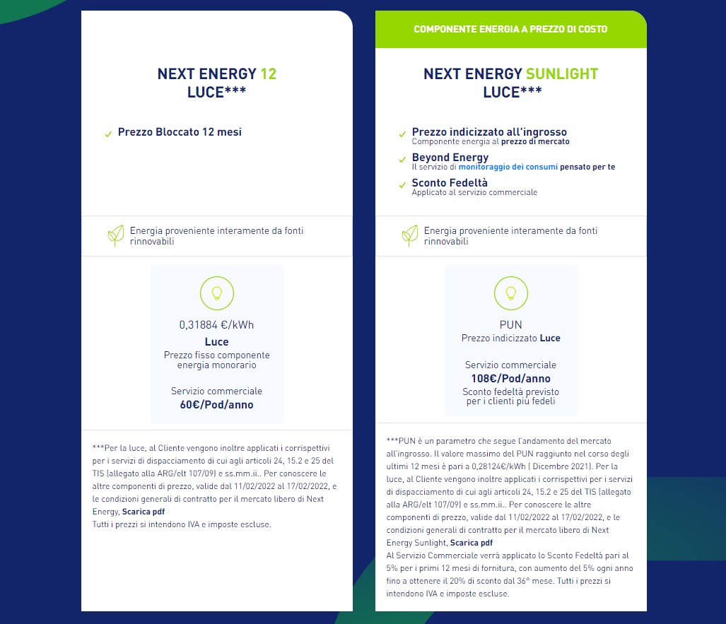 Al momento l’offerta per la fornitura di energia elettrica si declina in due offerte: a prezzo bloccato per la componente energia e con prezzo indicizzato all’ingrosso. Le offerte luce casa sono visionabili a questo indirizzo.