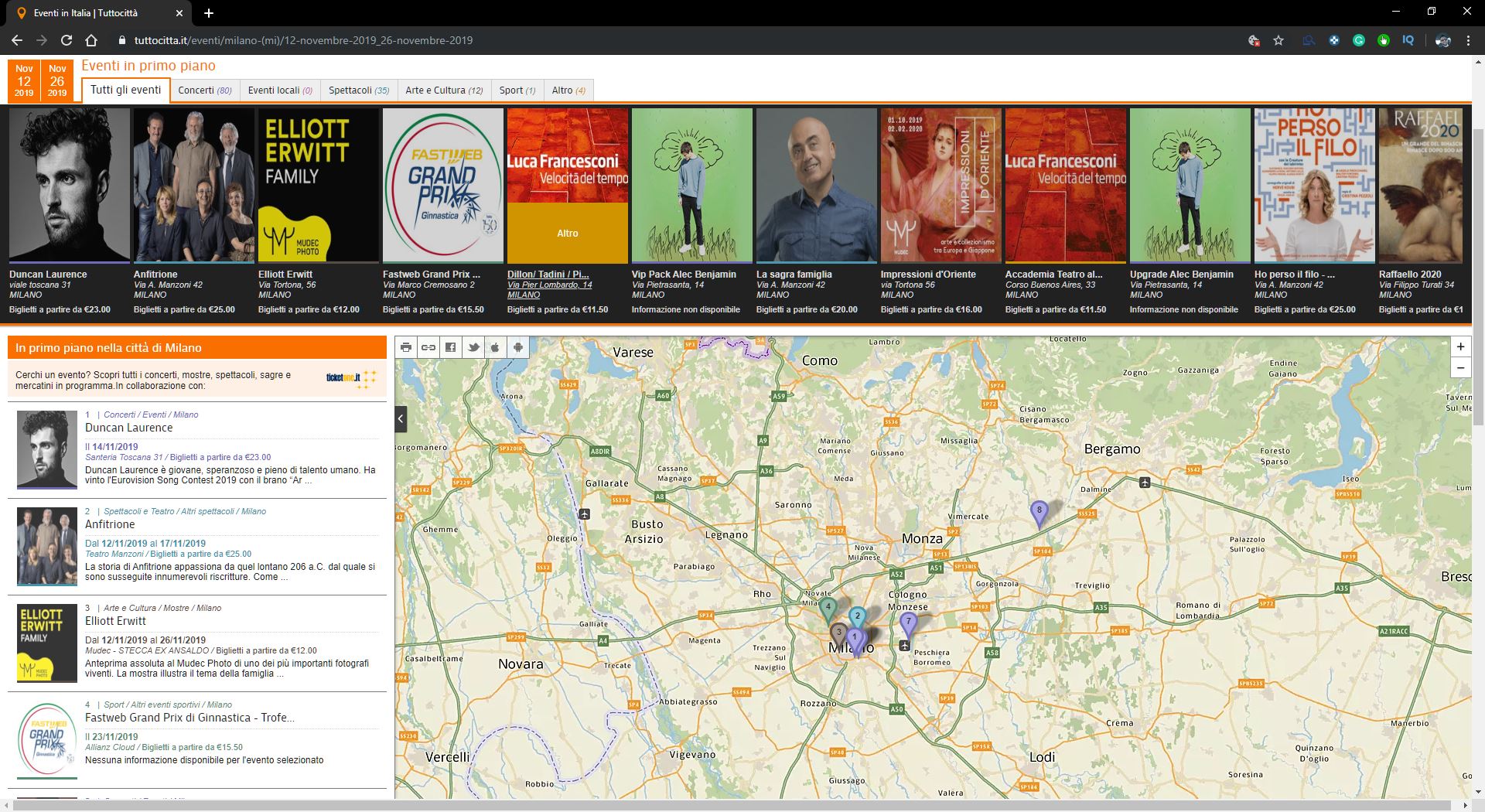 Se ad esempio andiamo su Eventi e impostiamo Milano come città potremo visualizzare concerti, opera, anteprime, sagre che si svolgono in città e nel suo circondario. Abbiamo anche la possibilità di impostare una data specifica per controllare se ci saranno eventi in futuro.