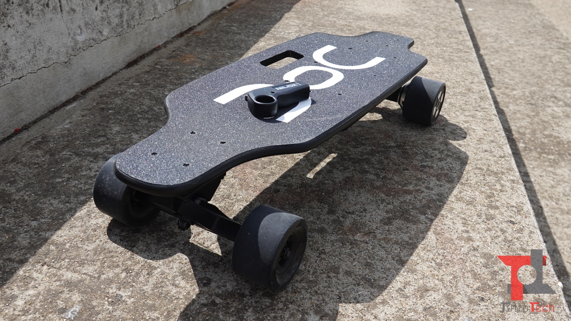 Arriva in una bella scatola con tutto il necessario per sfruttarlo al massimo: oltre allo skateboard troviamo il telecomando, il caricabatterie (si ricarica totalmente in circa 2 ore), il manuale d’uso e l’attrezzo per stringere o allargare i truck e le viti dello skateboard.