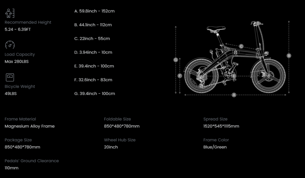 Pur essendo una bici pieghevole, le geometrie permettono range elevato di compatibilità per la statura del rider, da 160 cm a circa 190 cm. Nell’immagine a seguire tutte le misure.