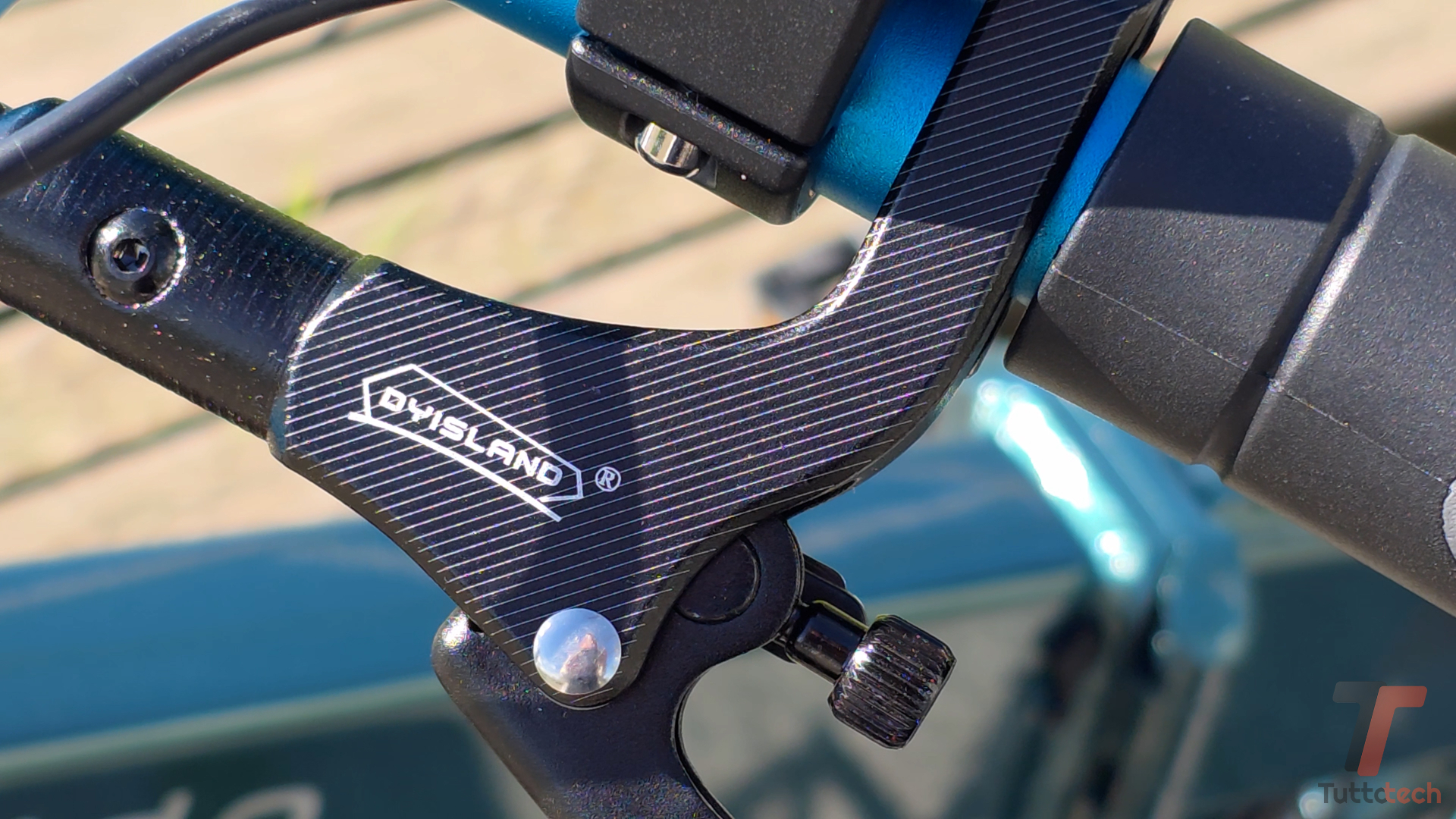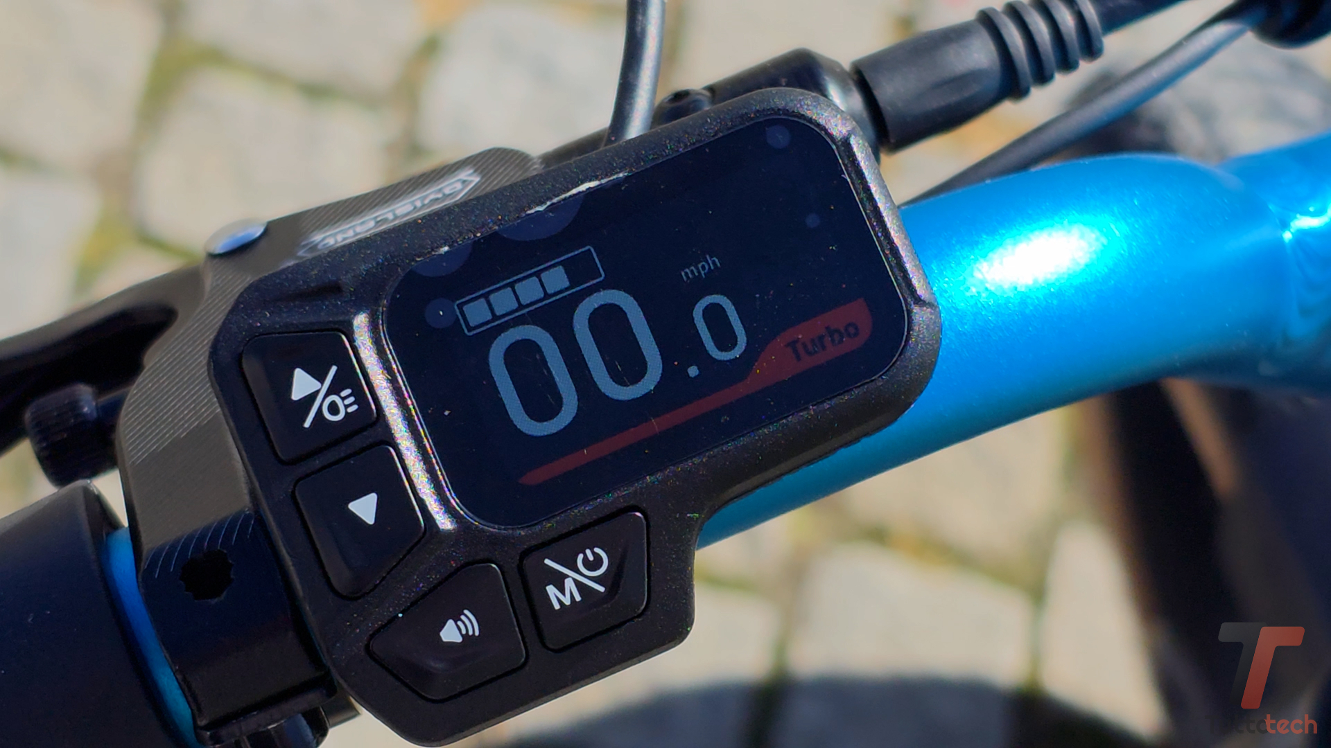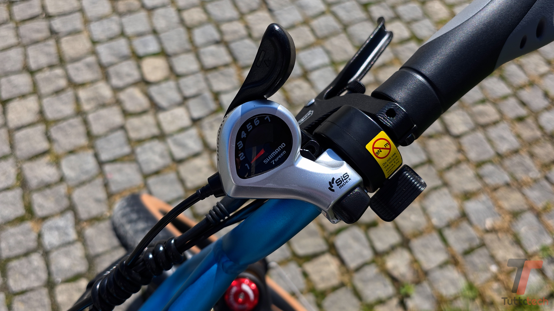Sul manubrio trova posto un controller con display da 1,47″ integrato con cui è possibile selezionare i livelli di assistenza alla pedalata, accendere/spegnere, attivare il faretto anteriore (posteriormente è assente) e azionare il campanello elettronico, mentre sullo schermo troveremo le informazioni su velocità, assistenza, autonomia e distanza. È presente anche un acceleratore ma di fabbrica nella versione europea è limitato a 6 Km/h per rispettare la normativa, volendo comunque è possibile rimuoverlo fisicamente dal manubrio e scollegare il cavetto.