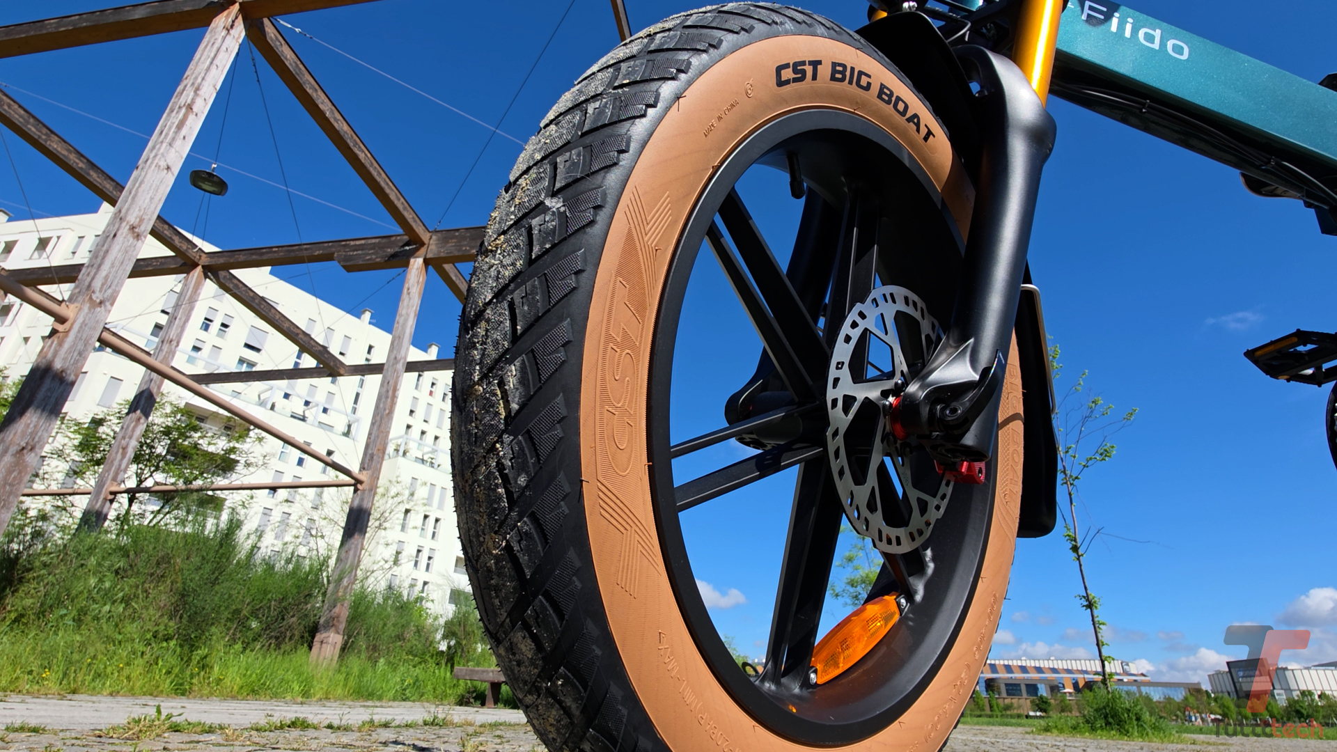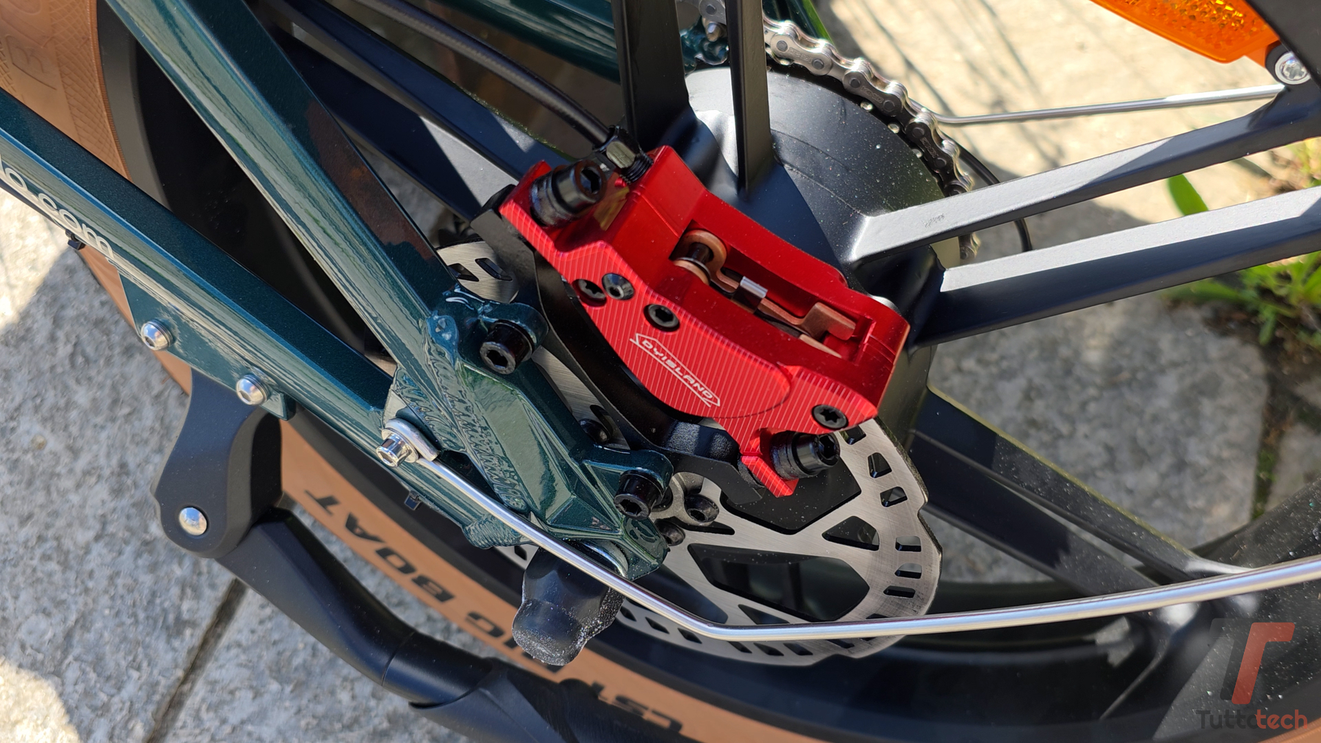 La Fiido M1 Pro 2025 è una bici biammortizzata, se frontalmente troviamo una forcella a molla a doppia piastra da 80 mm di travel, posteriormente c’è un ammortizzatore a molla con travel contenuto (non abbiamo info dettagliate) regolabile nel precarico. I freni sono idraulici a doppio pistone, mentre la trasmissione è affidata ad un cambio Shimano a 7 rapporti con deragliatore Turney, pignoni 14-28T e mono corona 52T, la catena è una KMC Z7.
