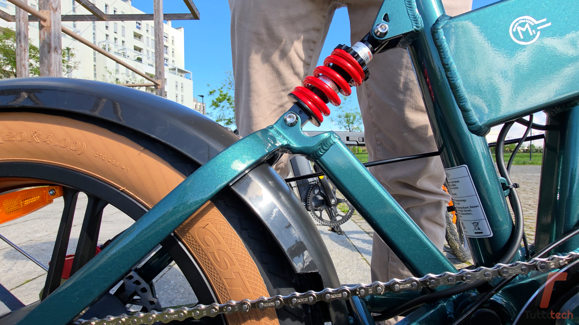 La M1 Pro 2025 è una bici che si guida molto bene: il manubrio alto, le ruote da 20″ e il passo contenuto la rendono molto più maneggevole di quel che si potrebbe pensare leggendo dei suoi 26 Kg di peso. Come ci capita spesso di sottolineare, poi, i componenti fanno la differenza e qui un sensore di coppia preciso, il motore che spinge forte all’occorrenza, freni e cambio affidabili e due ammortizzatori che, per quanto basilari, svolgono correttamente il loro lavoro riescono a rendere la guida estremamente comoda ed efficace.