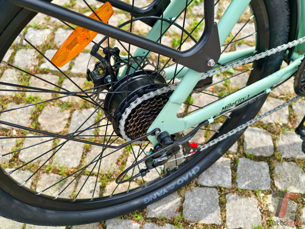 Passando al comparto elettrico, la MileCity 1 monta una batteria da 480 Wh ben integrata nel telaio e un motore da 250 W di potenza nominale, posizionato nel mozzo posteriore. Il grande assente, però, è il sensore di coppia: l’erogazione dell’assistenza si basa esclusivamente su un sensore di pedalata, una scelta che comporta alcune conseguenze sul feeling di guida, ma di questo parleremo tra poco.