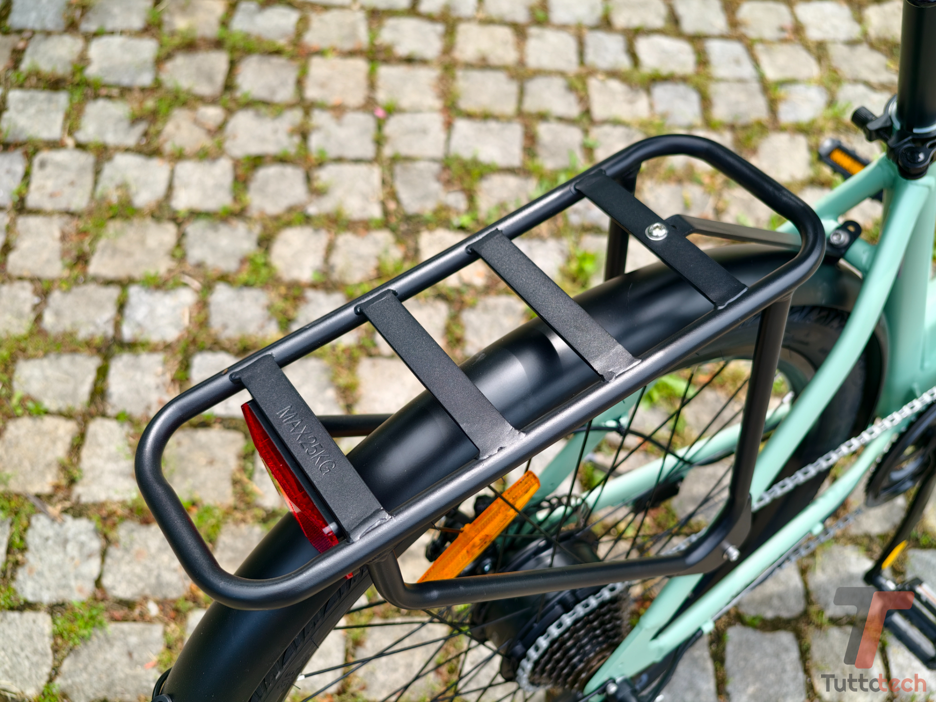 La parte posteriore del telaio non è ammortizzata, ma la sella integra due piccole molle che aiutano ad assorbire le asperità dell’asfalto urbano, offrendo una guida comunque confortevole. Tra gli accessori inclusi troviamo un portapacchi posteriore omologato per 25 kg, i due parafanghi anteriore e posteriore, un faretto anteriore controllabile dal manubrio, un catarifrangente posteriore e anche un cavalletto laterale, che si rivela sempre comodo nell’uso quotidiano.