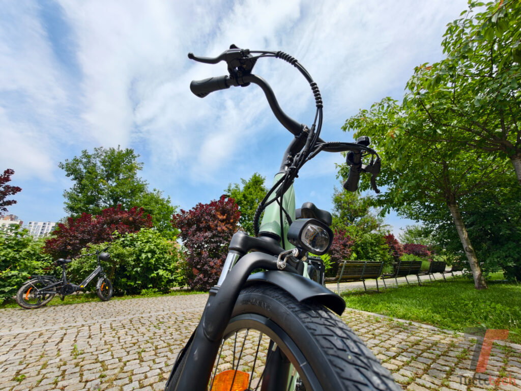La posizione di guida è molto eretta, complice un manubrio alto con rise marcato, che trasmette un senso di stabilità e controllo sin dai primi metri. Il motore, montato nel mozzo posteriore, ha una spinta decisa, ma la sua gestione è un po’ particolare: in assenza di un sensore di coppia, l’erogazione risulta abbastanza brusca. I livelli di assistenza, infatti, non regolano la potenza del motore, bensì la velocità massima fino a cui questa viene erogata: si parte da 10 km/h per il primo livello, poi 15, 20 e infine 25 km/h, che rappresenta il limite imposto dalla normativa.